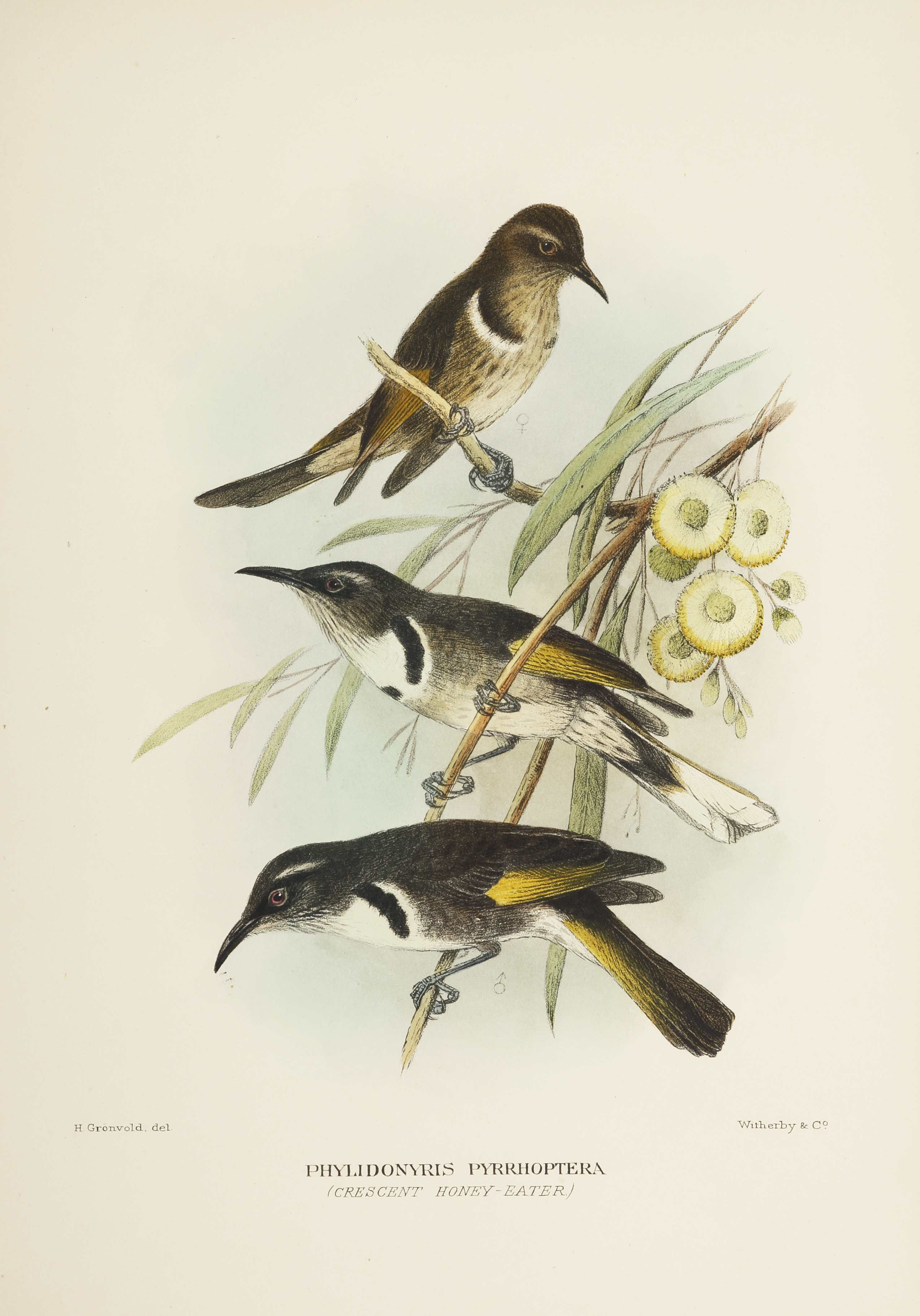 Superb lithograph with original hand colouring of the Crescent Honey Eater from the last great series on Australian ornithology, The Birds of Australia by G. Matthew’s. This series is rarer than John Gould’s work on Australian birds, with only 225 sets made. … Read Full Description