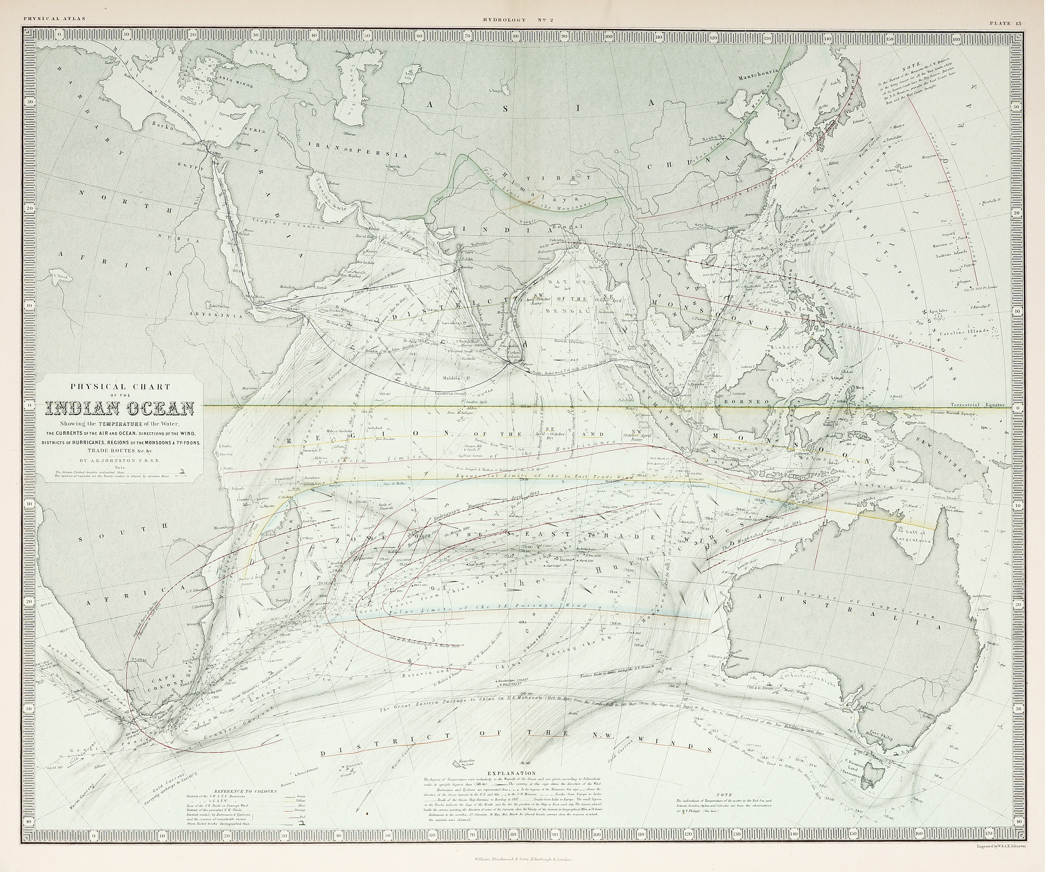 Spectacular meteorological map the Indian Ocean, from the extra large sized issue of Johnston’s, Physical Atlas of Natural Phenomena.The map has a compendium of information.