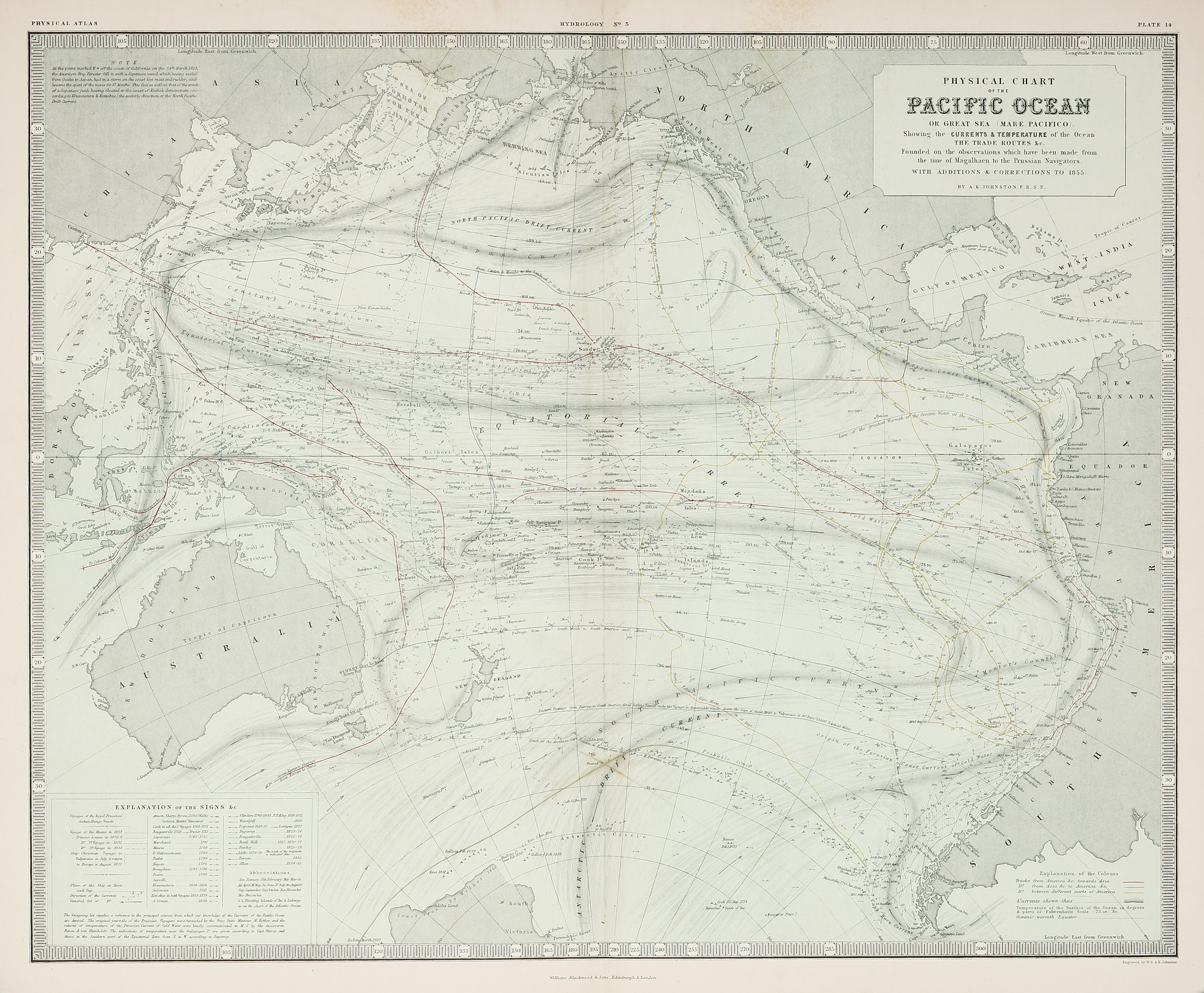 Spectacular meteorological map the Pacific Ocean, from the extra large sized issue of Johnston’s, Physical Atlas of Natural Phenomena.The map has a compendium of information.