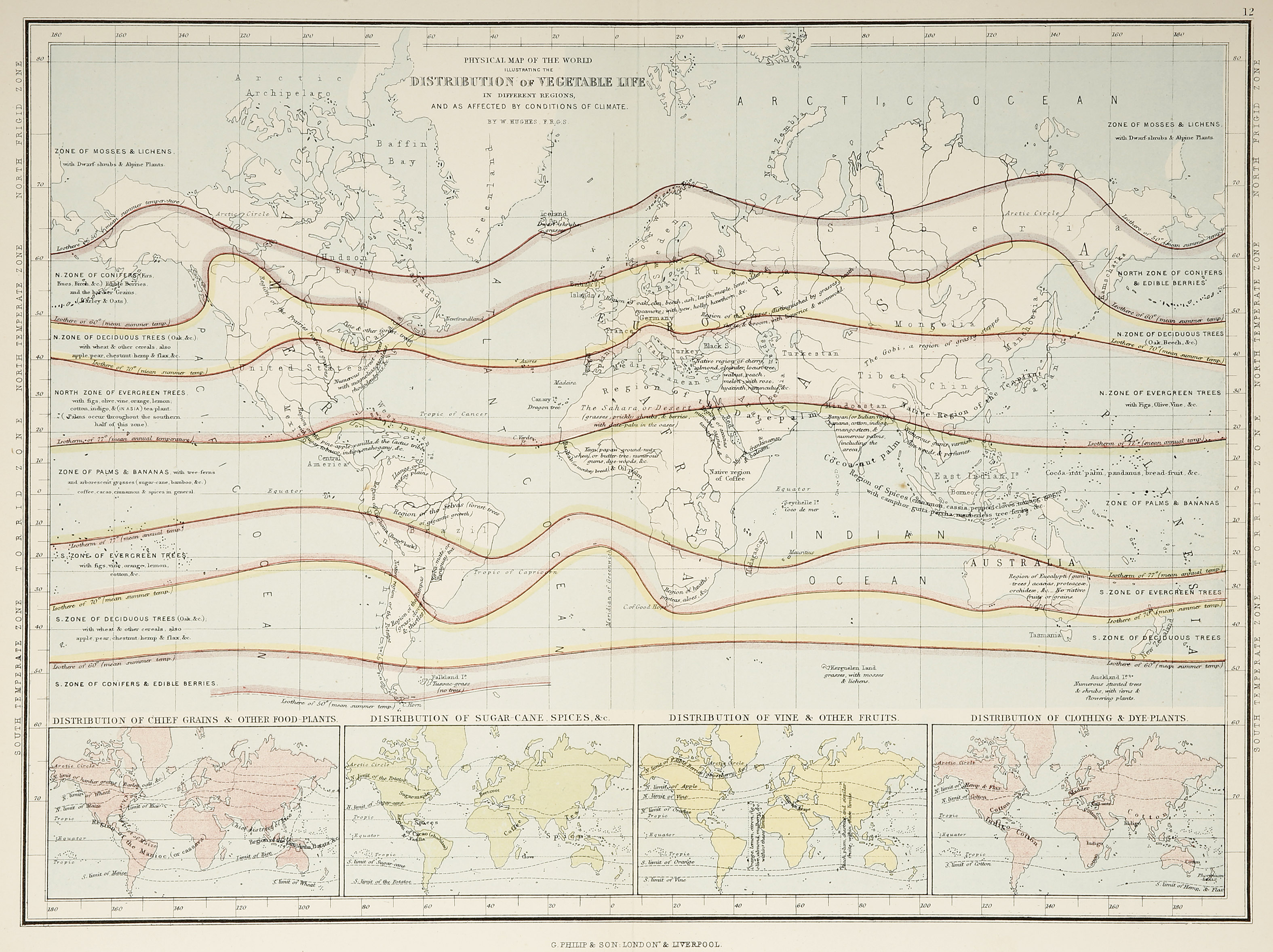 From Philips’ Atlas of Physical Geography, map of the world illustrating the distribution of vegetable life in different regions, and as affected by conditions of climate.