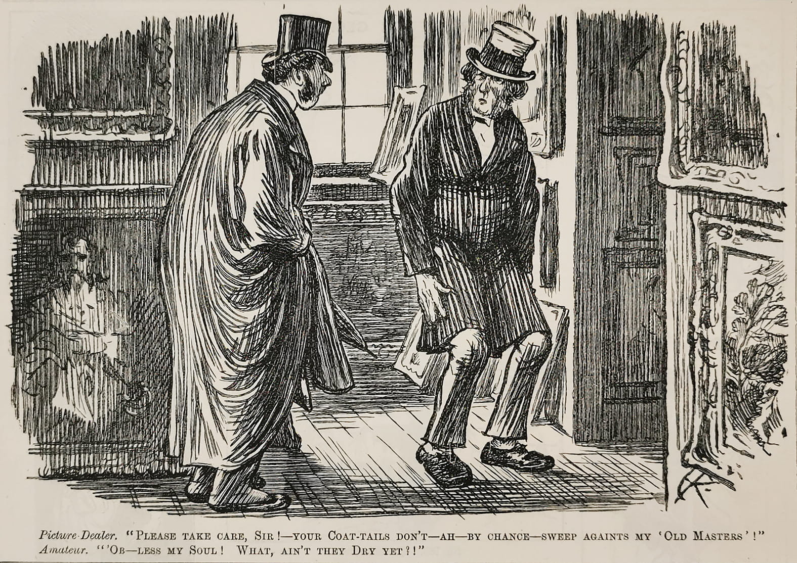 Engraving showing a conversation between the picture dealer and the amateur. From the original edition of Punch.