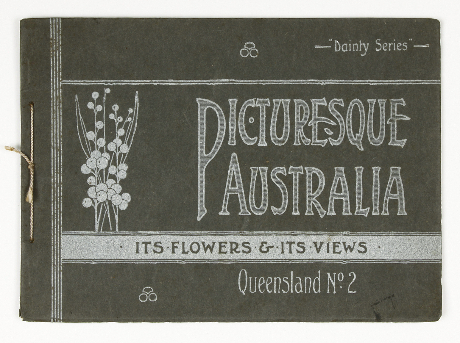 Paper bound, with pictorial cover, string tied. Oblong quarto, 24 pp, 13 leaves including the title page and each leaf has one photographic view. Printed one side of the paper only and each photographic illustration has a coloured drawing of a flower near by. Although it is