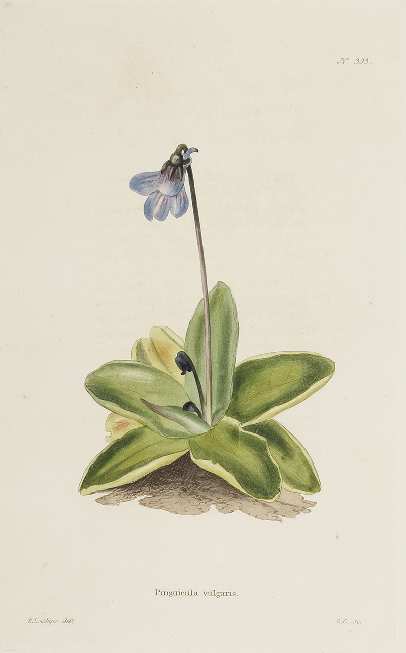 Fine early c.19th botanical engraving of the carnivorous Butterwort by Conrad Loddiges, The Botanical Cabinet, which was published from 1817 to 1822.