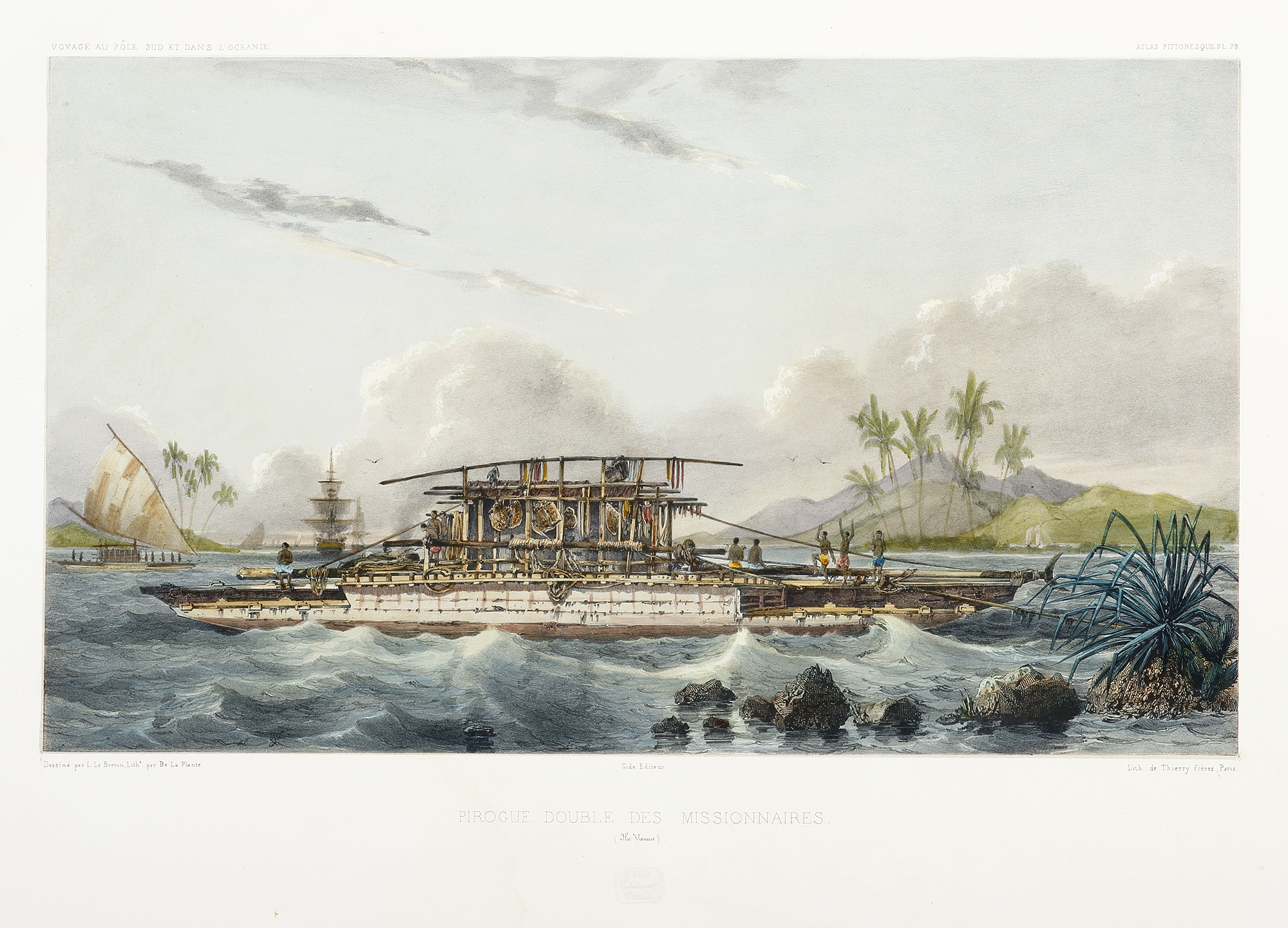 Superb lithograph of a missionary boat using the Tongan double canoe design with Dumont D’Urville’s ships, l’Astrolabe and Zélée at anchor in the background in Utu Vavaʻu by Louis le Breton (1818-1866).