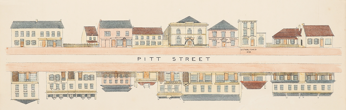 Scarce, hand coloured c.19th engraving of Pitt Street.