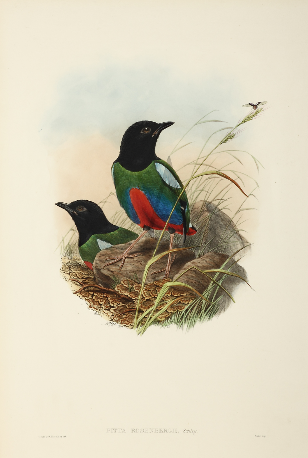 Gould common name : Rosenberg’s Pitta Gould binomial name : Pitta rosenbergii Modern common name : Hooded pitta (rosenbergii) Modern binomial name : Pitta sordida rosenbergii First described : Schelgel 1871