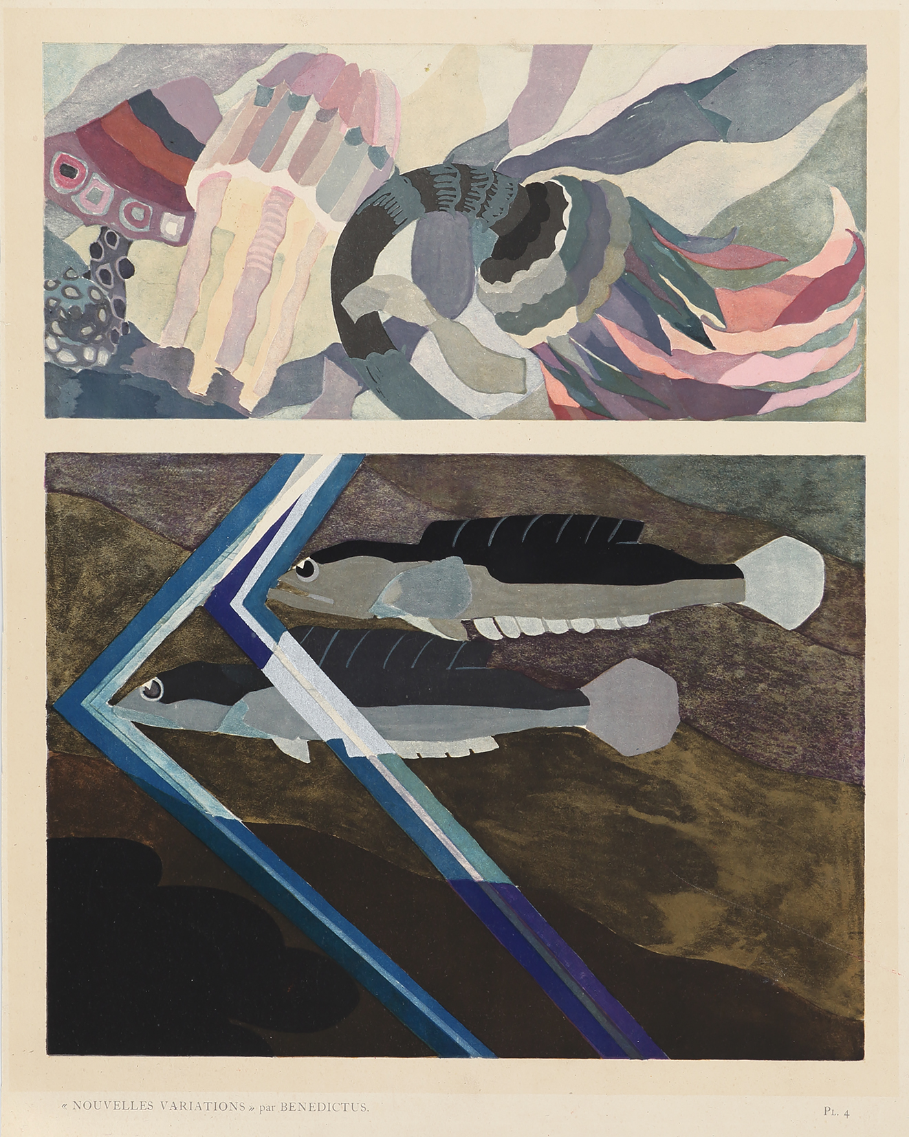 Multifaceted figure of the early c.20th, distinguished as a painter, writer, composer, and chemist. His career began during the flourishing Art Nouveau period, a movement that celebrated organic forms and intricate details. Benedictus contributed to this artistic dialogue with his 1912 article in L'Art décoratif, which was highly influential at the time. However, his artistic sensibilities evolved in response to the shifting aesthetics of the 1910s, embracing the emerging Art Deco style that would come to dominate design in the 1920s. Benedictus became renowned for his luxurious portfolios, particularly Variations (1923) and Nouvelles Variations (1928), works that solidified his status as a key figure in the floral Art Deco movement. His designs, celebrated for their bold geometric patterns and imaginative color schemes, also featured abstract floral motifs that pushed the boundaries of decorative arts. Benedictus played a pivotal role in the celebrated Pavillon de l'Ambassade Française at the 1925 Exposition Internationale des Arts Décoratifs in Paris. His collaboration with leading designers, notably André Groult, for whom he created tapestries and rugs, made a lasting impact. His intricate pochoir works adorned the Grand Salon and Music Room of the French Embassy, showcasing his mastery in transforming spaces through art. His signature pochoir designs, filled with vivid geometric abstractions and floral motifs, remain timeless testaments to the stylistic innovation of the Art Deco era.