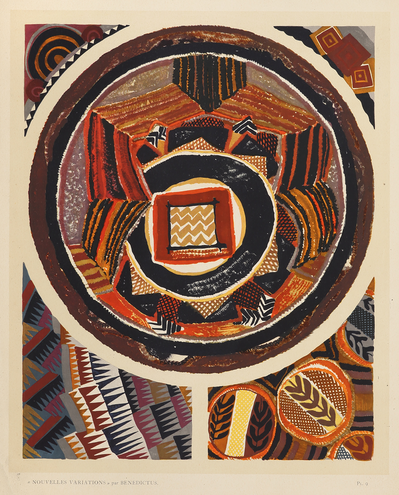 Multifaceted figure of the early c.20th, distinguished as a painter, writer, composer, and chemist. His career began during the flourishing Art Nouveau period, a movement that celebrated organic forms and intricate details. Benedictus contributed to this artistic dialogue with his 1912 article in L'Art décoratif, which was highly influential at the time. However, his artistic sensibilities evolved in response to the shifting aesthetics of the 1910s, embracing the emerging Art Deco style that would come to dominate design in the 1920s. Benedictus became renowned for his luxurious portfolios, particularly Variations (1923) and Nouvelles Variations (1928), works that solidified his status as a key figure in the floral Art Deco movement. His designs, celebrated for their bold geometric patterns and imaginative color schemes, also featured abstract floral motifs that pushed the boundaries of decorative arts. Benedictus played a pivotal role in the celebrated Pavillon de l'Ambassade Française at the 1925 Exposition Internationale des Arts Décoratifs in Paris. His collaboration with leading designers, notably André Groult, for whom he created tapestries and rugs, made a lasting impact. His intricate pochoir works adorned the Grand Salon and Music Room of the French Embassy, showcasing his mastery in transforming spaces through art. His signature pochoir designs, filled with vivid geometric abstractions and floral motifs, remain timeless testaments to the stylistic innovation of the Art Deco era.