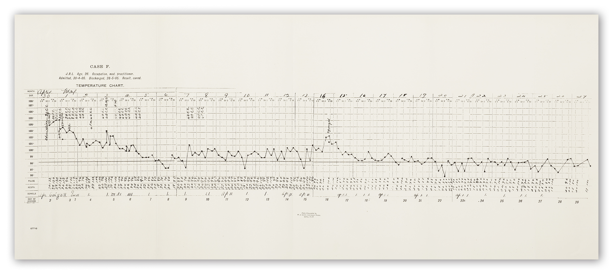Very rare hospital chart showing temperatures for a plague infected person admitted 30th April, 1905.