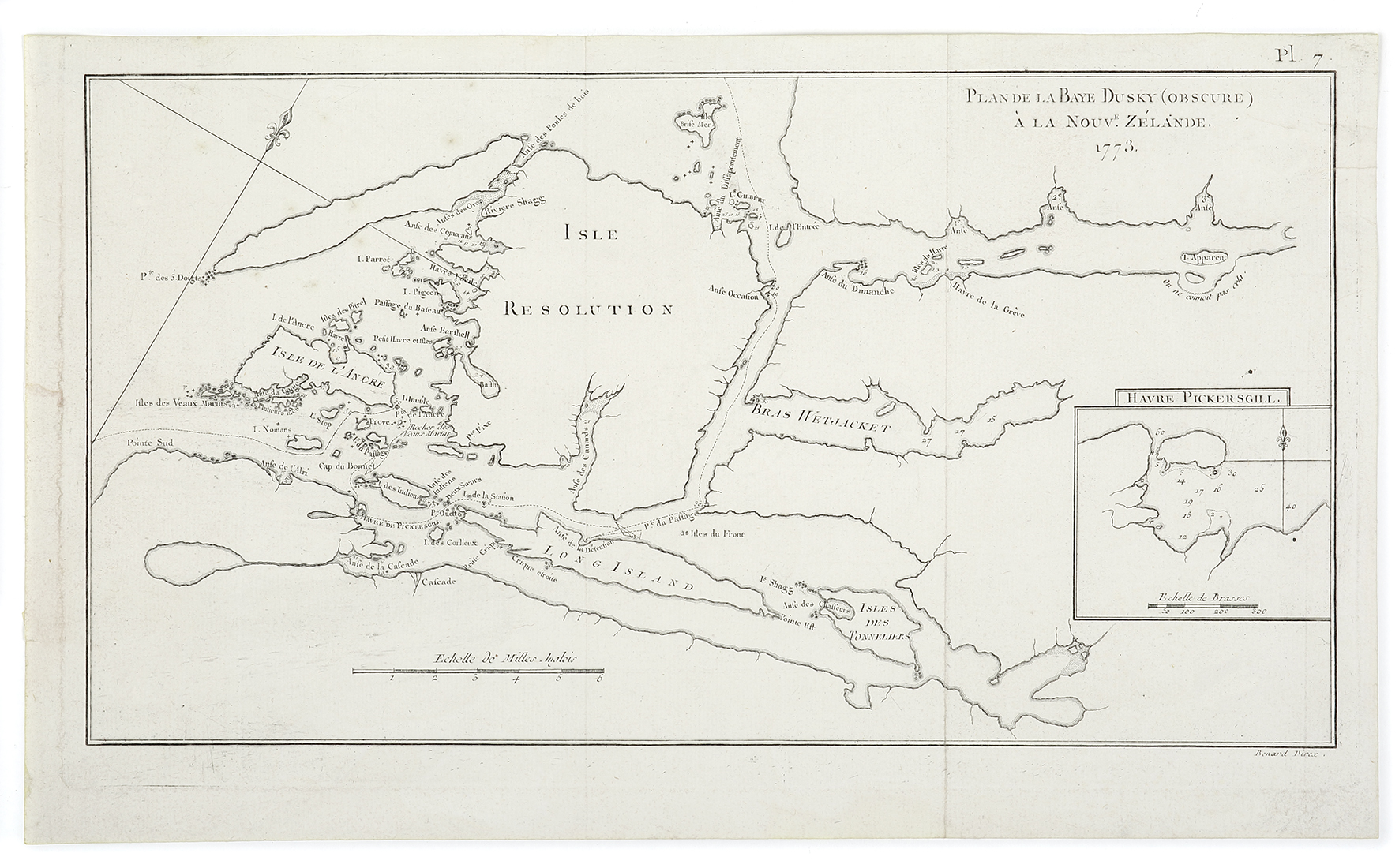 French edition of Cook’s map of Dusky Bay and Resolution Island, with an inset of Pickersgill Harbour at right and showing the tracks of the Resolution.