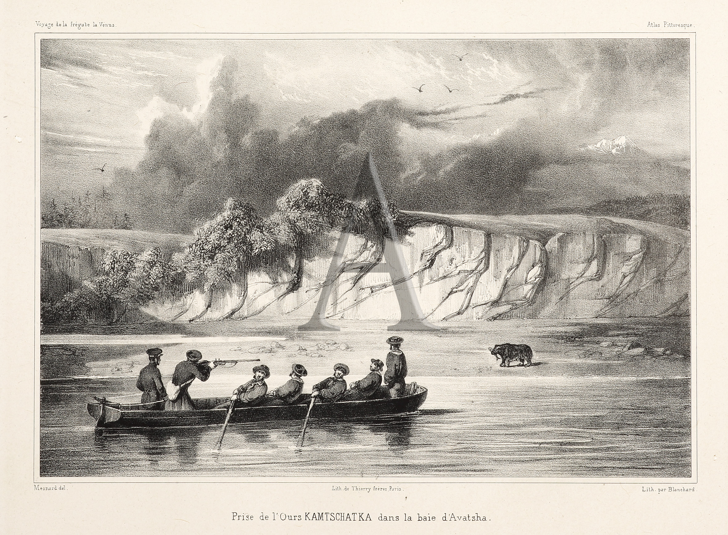 Then on 25/8/37 Cape Povorotnyy, to the south of Petropavlovsk in Kamachatka (Russia), was sighted, and on 31/8/37, after fog had concealed the coast for five days, the Venus entered Avacha Bay. There the French were warmly welcomed by Governor Shakov, who placed a house at Dupetit-Thouars disposal for an observatory and organised hunting trips for the officers.
