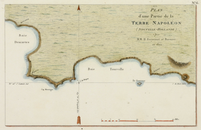Bridgewater Bay and the first printed map of this area. Louis Claude Freycinet (1779-1842) Cartographic surveyor & naturalist on board the ill-fated Baudin expedition. He produced all the engraved charts from the official account of the voyage. The charts of the South coast are the first engraved charts ever made of those areas.