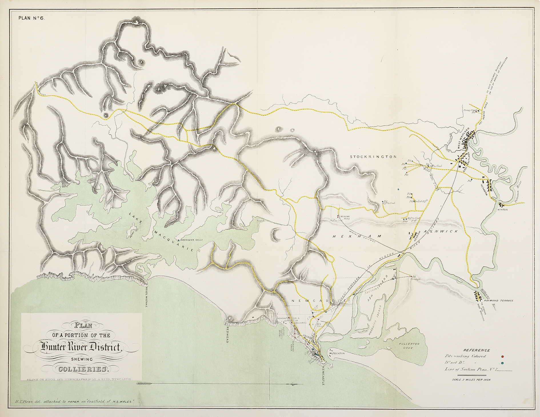 Very rare early map showing the coal discoveries at Hunter River, Newcastle by Henry Taylor Plews. From; Transactions of the North of England Institute of Mining Engineers Collections: Not found in Trove