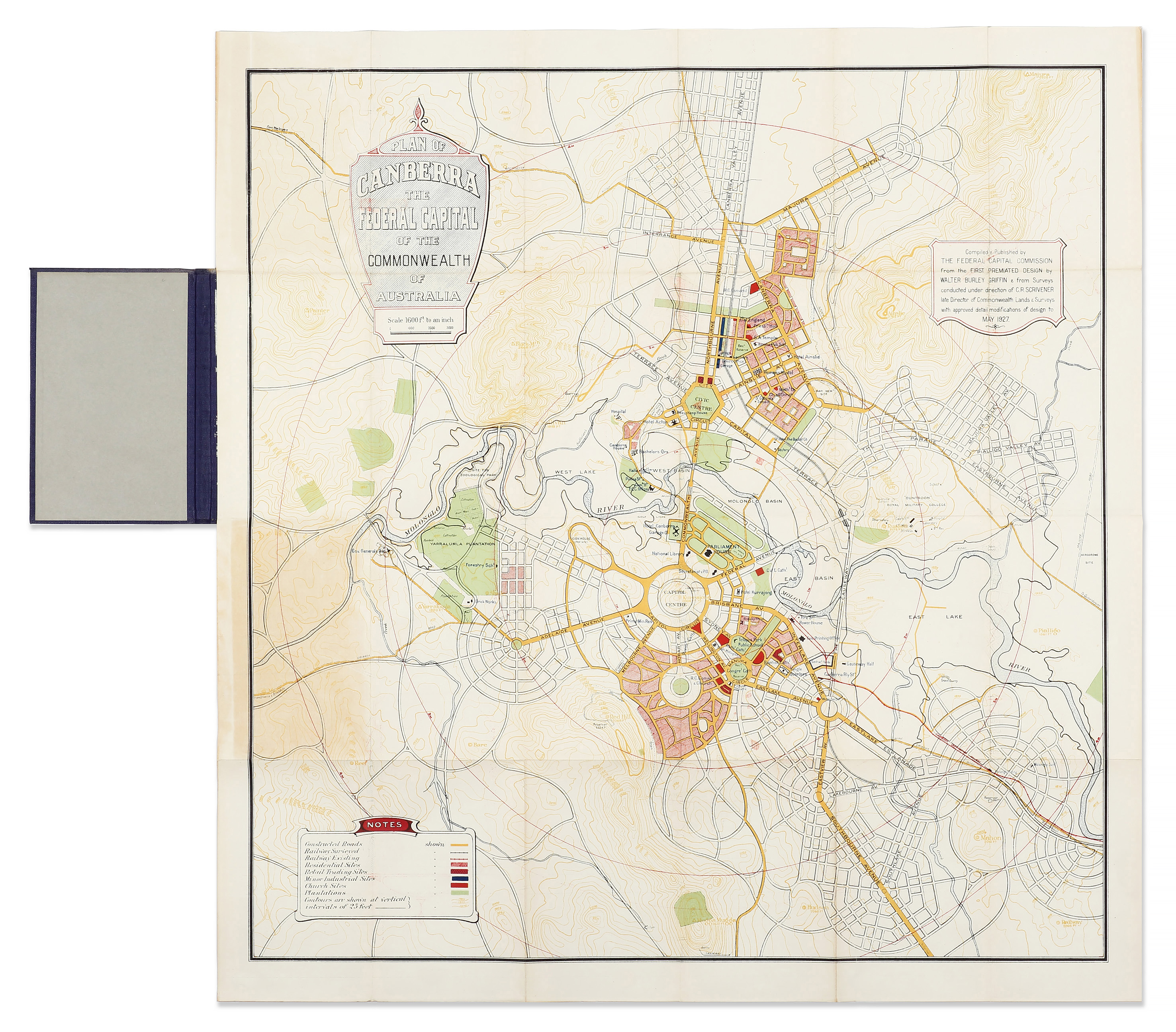 Compiled from the First Premiated Design by Walter Burley Griffin and from surveys conducted under the direction of C.R. Scrivener, late Director of Commonwealth Lands and Surveys with approved detail modifications of design to May 1927.