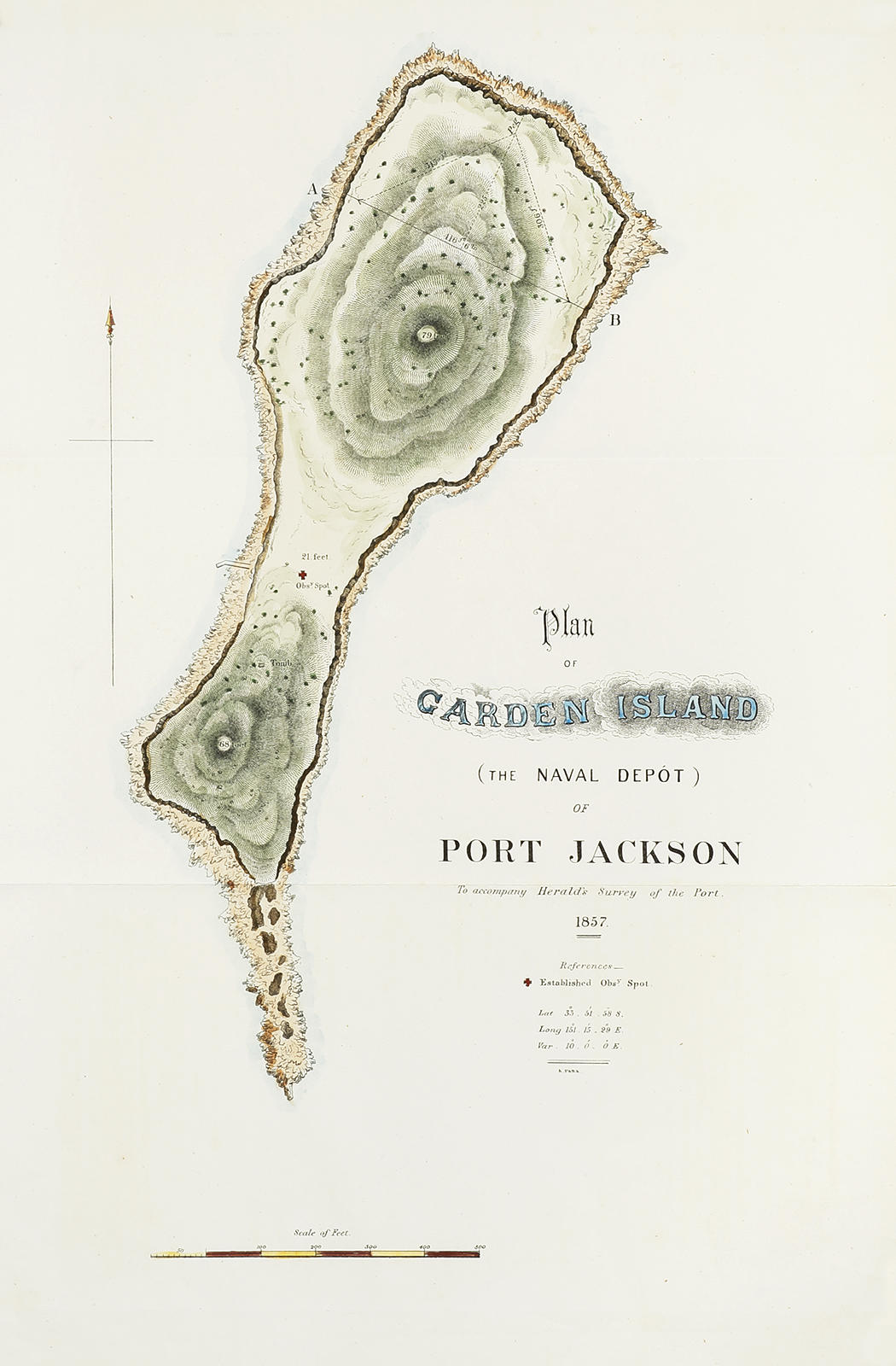 Rare c.19th map of Garden Island, Sydney. Very rare colonial map of Garden Island from the surveys made by Captain Henry Mangles Denham of HMS Herald dated 1857. The significance of this map is that it records of the use of … Read Full Description