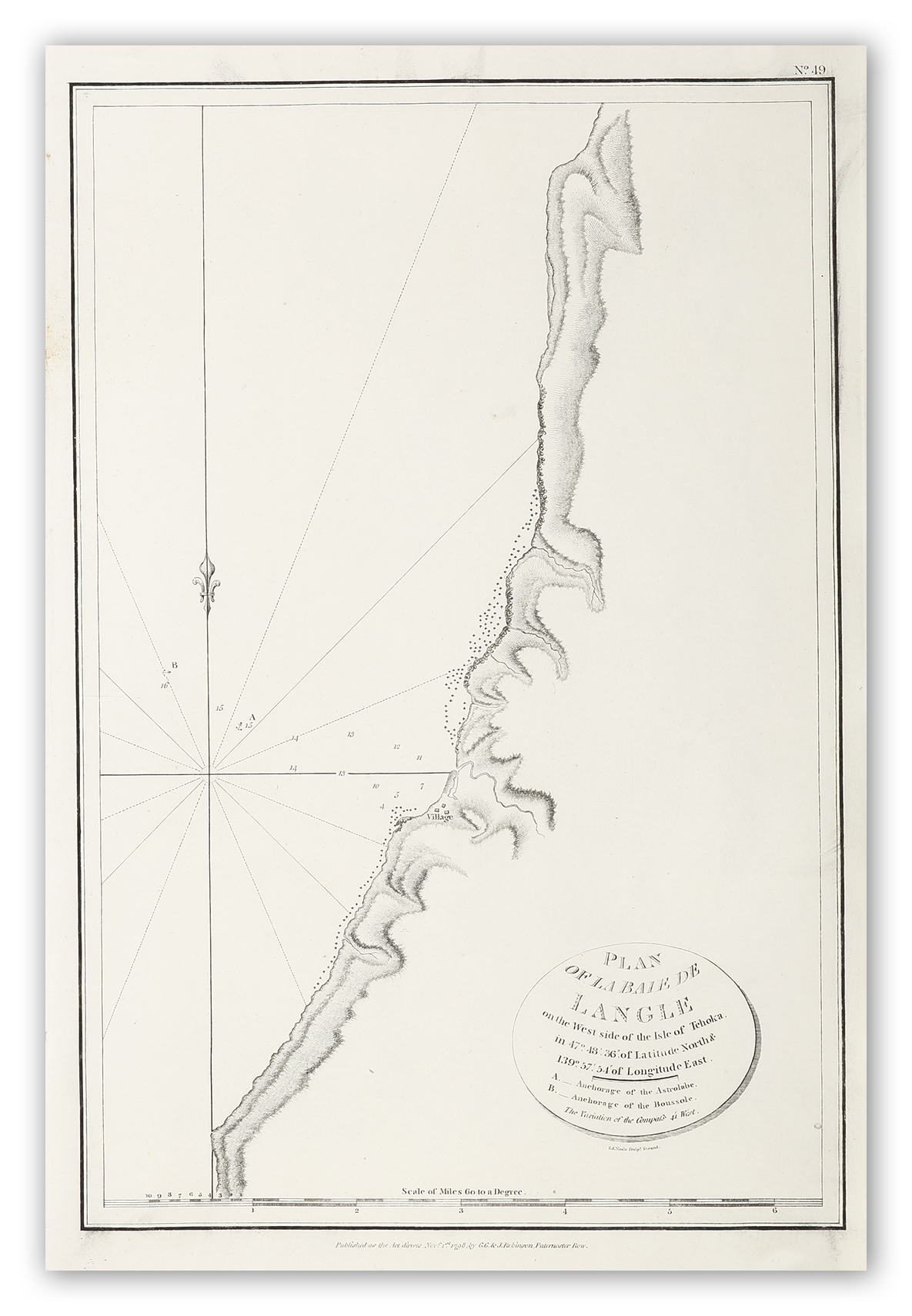 Map of the western coast of Sakalin Island, Russia by La Perouse of Pago Pago, Samoa. The tracks of La Perouse’s ships, Bonssole and Astrolabe in 1786 are shown. From, Charts and Plates to La Perouse’s Voyage.