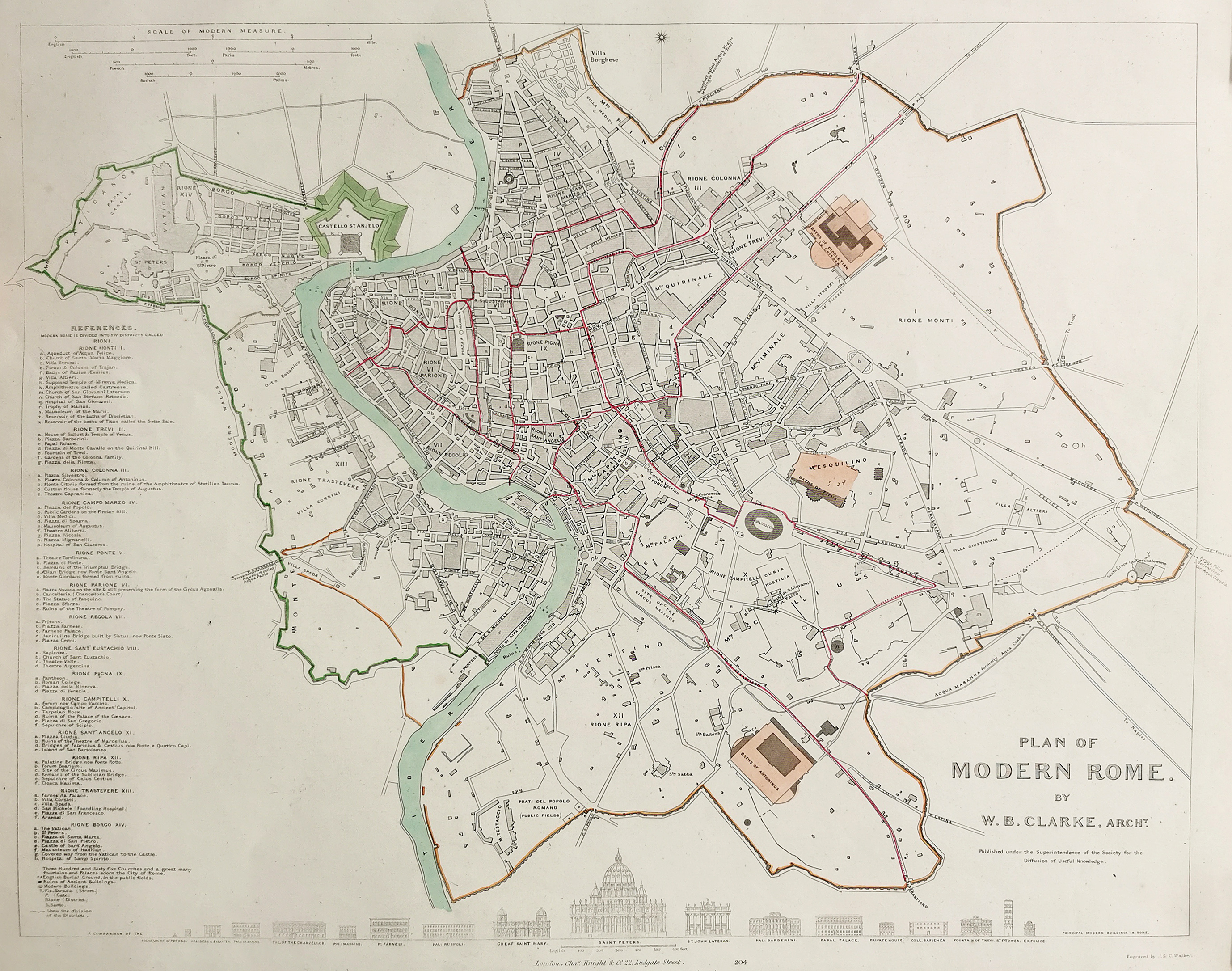 Detailed plan of the Eternal City, with engraved elevations of prominent buldings along the lower section of the map. Published by the Society for the Diffusion of Useful Knowledge.