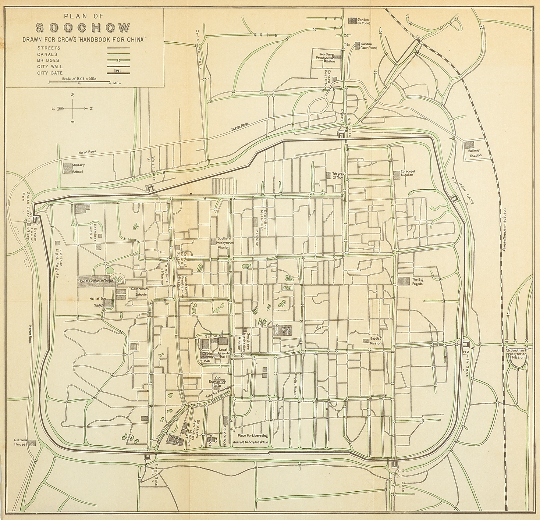 Detailed c.20th map of the world heritage walled city of Suzhou, China. Collections: National Library Australia: Bib ID 7794293 State Library Victoria: S 915.1 C88 (1913) Getty Museum Los Angeles: ID/Accession Number 2711-672 National Library Board Singapore: Identifier: (OCoLC)308876318