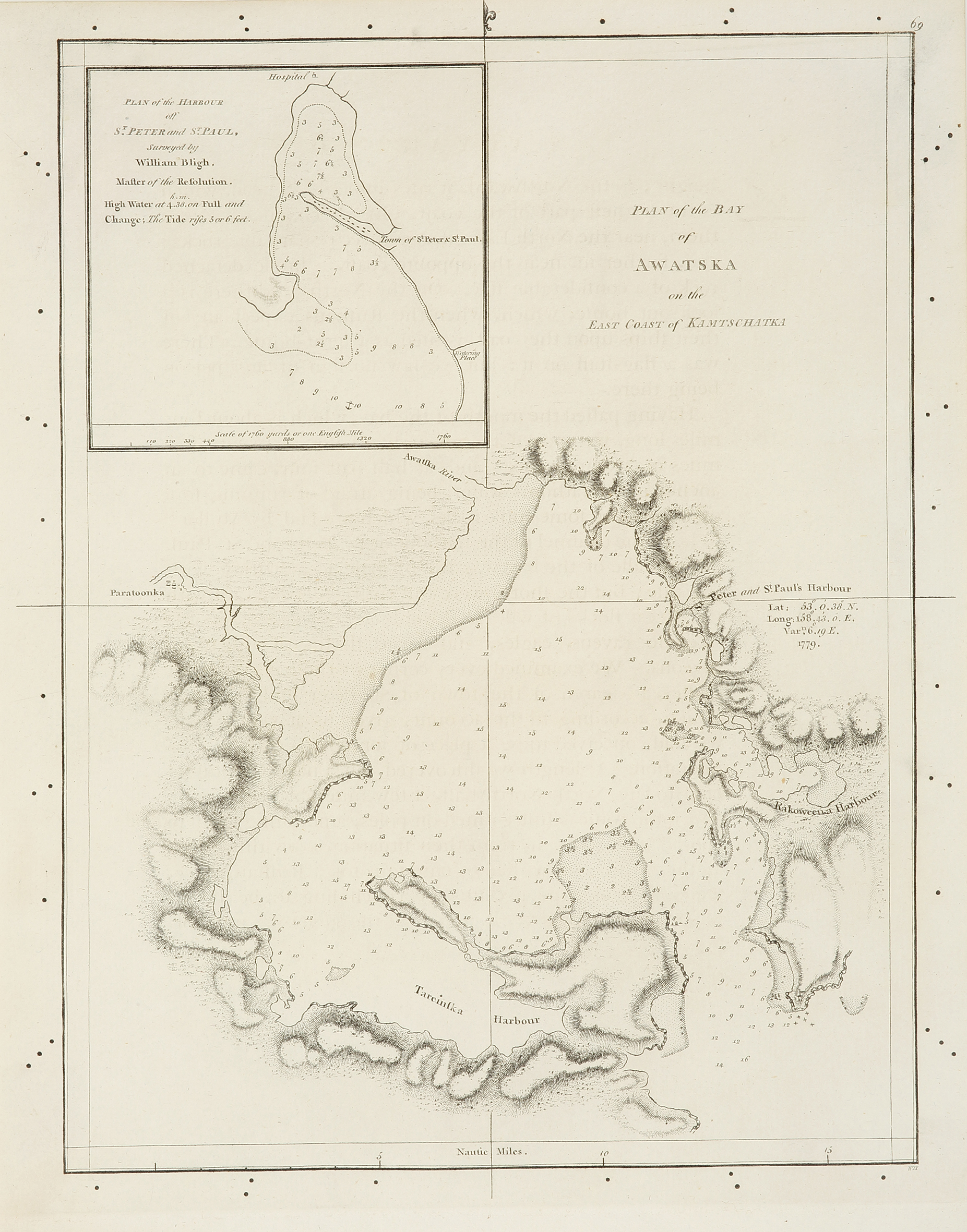 Map of Avacha Bay, Russia, on the east coast of Kamchatka Peninsula, with an inset of, ‘Plan of St. Peter and St. Paul, surveyed by William Bligh, Master of the Resolution. The expedition was to visit Avacha Bay twice, 29 April to 16 June 1779 and again 24 August to 10 October 1779.