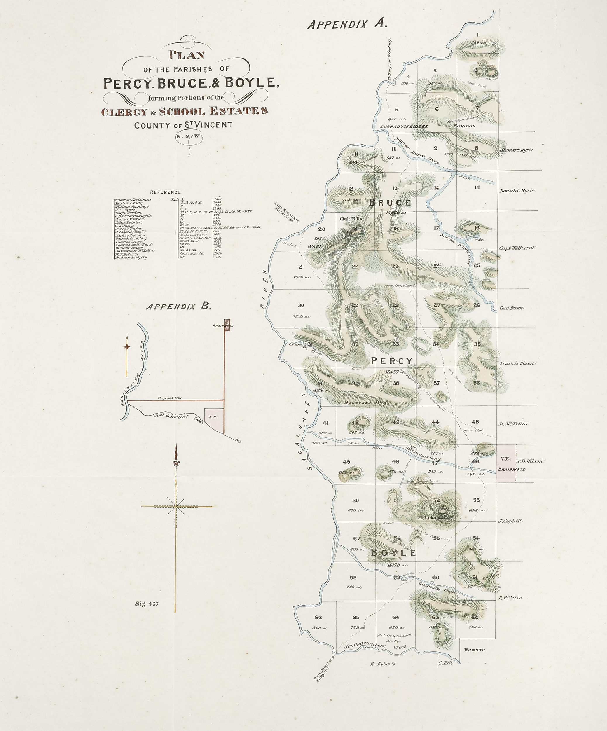 Very rare c.19th parish map showing the ‘Church and School Estates‘ which comprised the three parishes of Percy, Bruce and Boyle surrounding the town of Braidwood, New South Wales. The counties covered an area of forty two thousand, four hundred and sixty acres. The map extends from Durran Durra Creek in the north, south to Jembaicumbene Creek and west to the Shoalhaven River. The area had an influx of prospectors after the discovery of gold in the 1850’s.