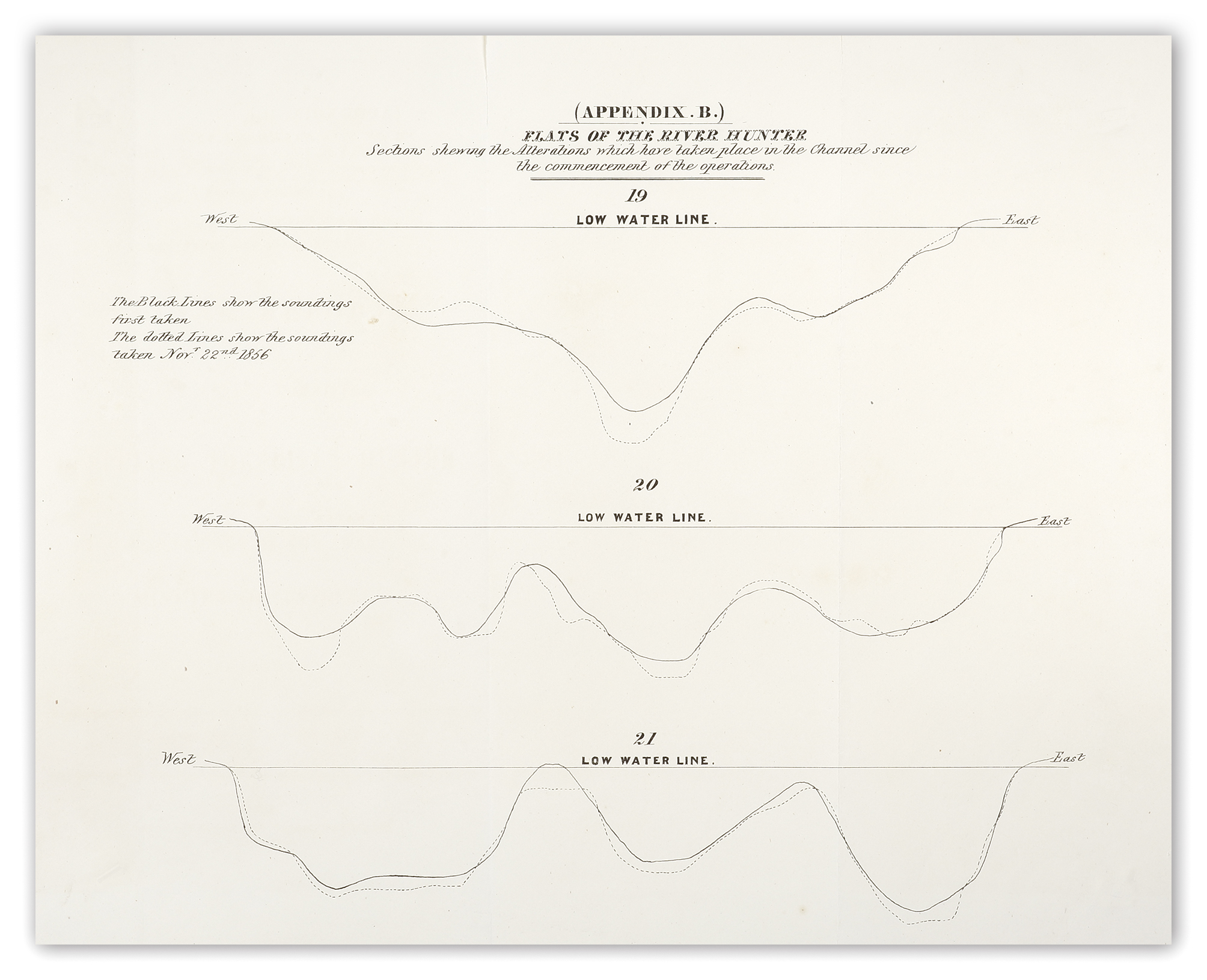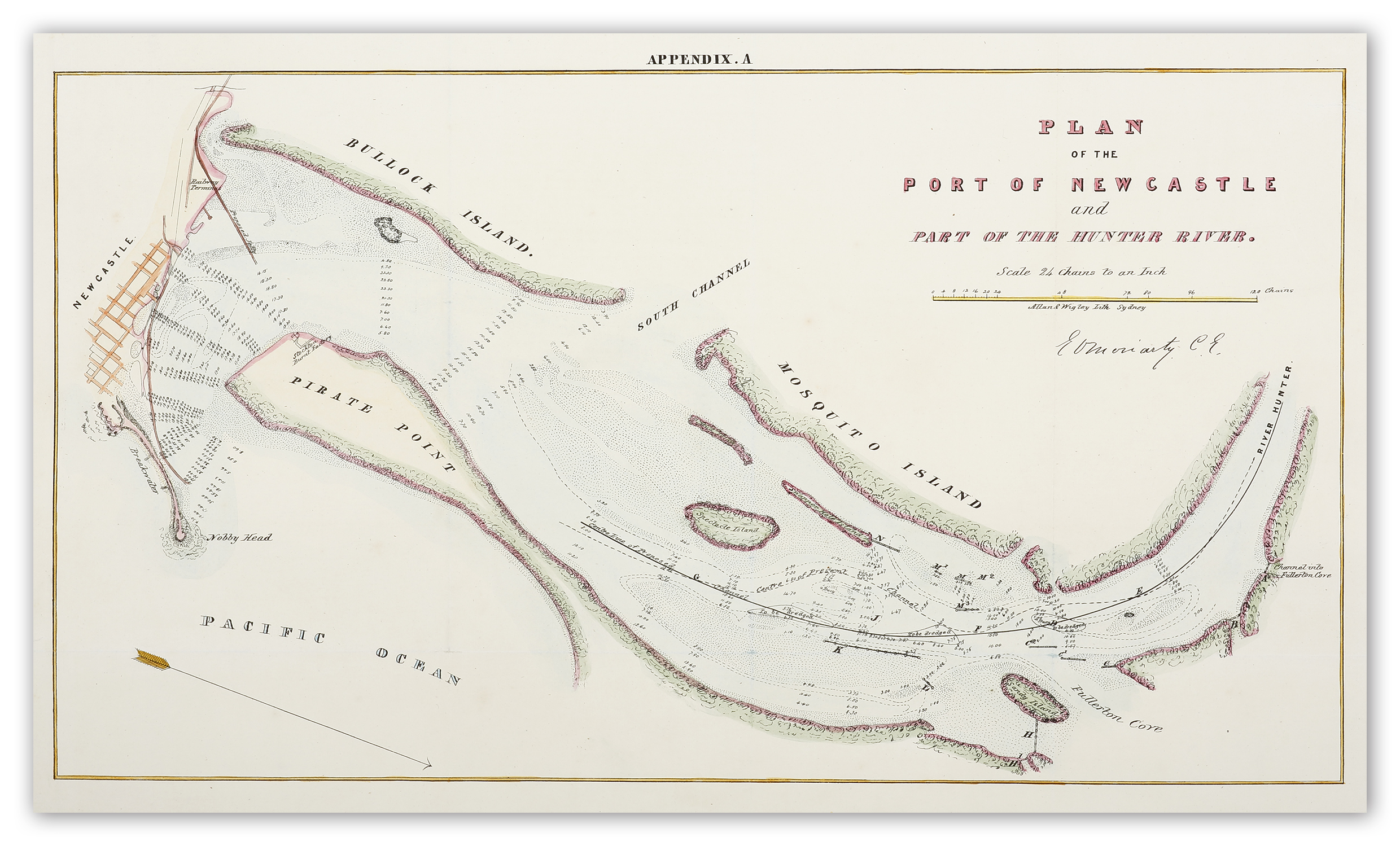 Very rare pair of early plans of Newcastle and the Hunter River, showing intended dredging and widening of the river. The works were a reflection of the importance of the trade that passed through the port of Newcastle and were proposed and executed, to ensure the safety of passage for ships in the Hunter River.