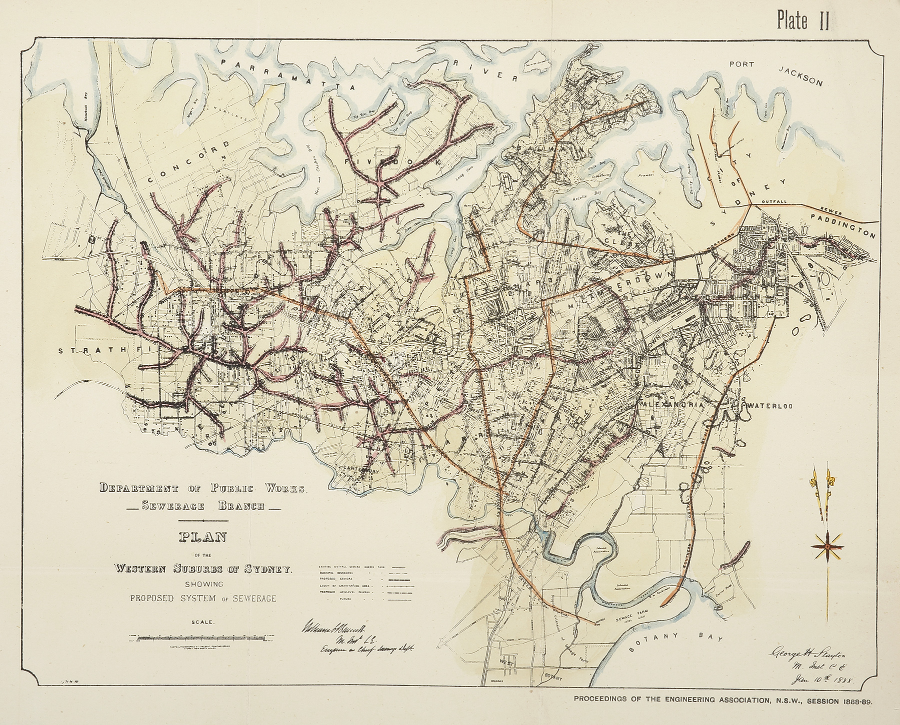 Detailed c.19th plan showing the proposed sewerage system for western Sydney.