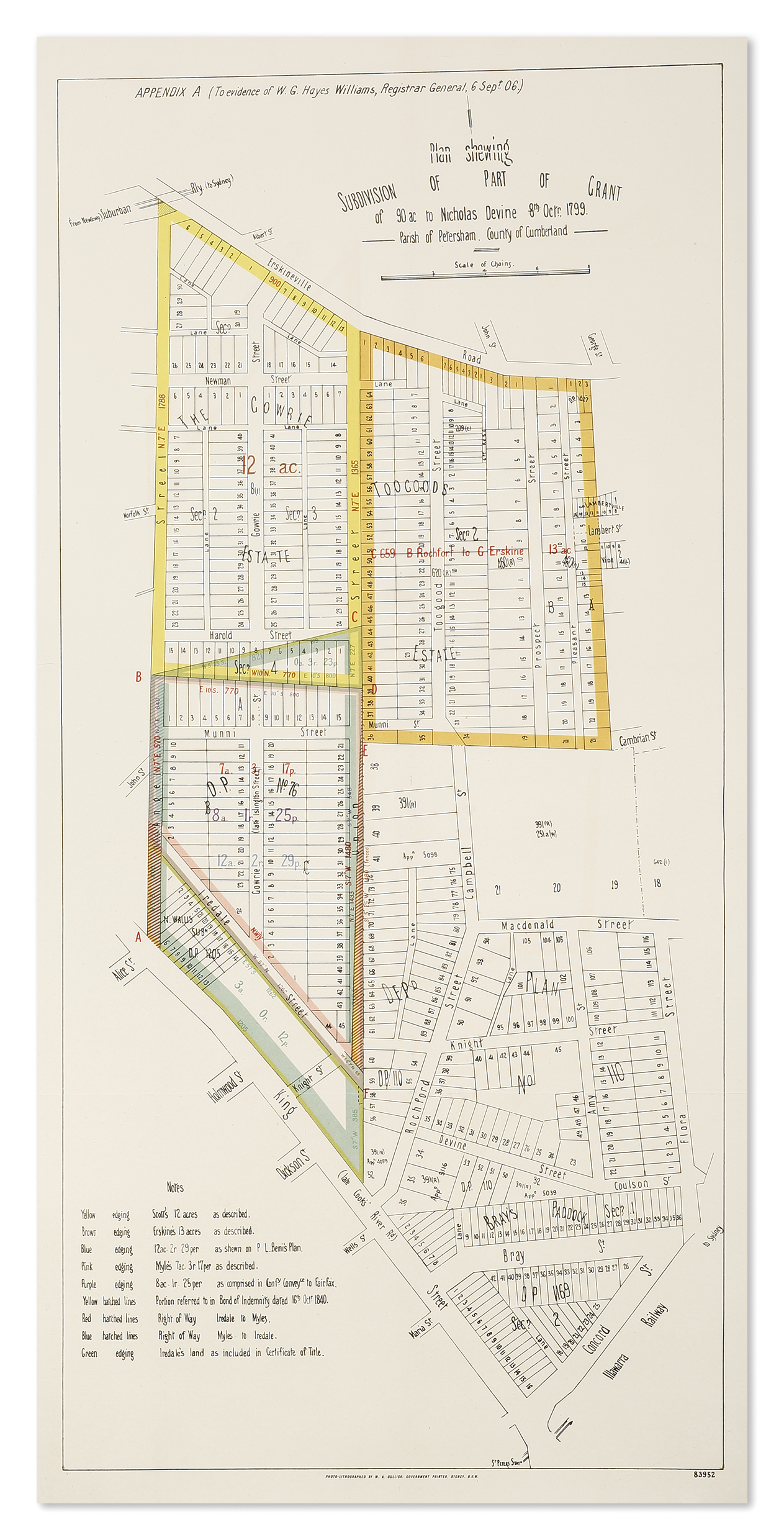 Plan of the grant and dispute over land in present day Erskineville and Newtown in the estate Nicholas Devine who had arrived in Sydney with the second fleet in 1790 to take up the position of superintendent of convicts. The map covers the area from Angel Street, Erskineville Road, to Fiora and King Street.