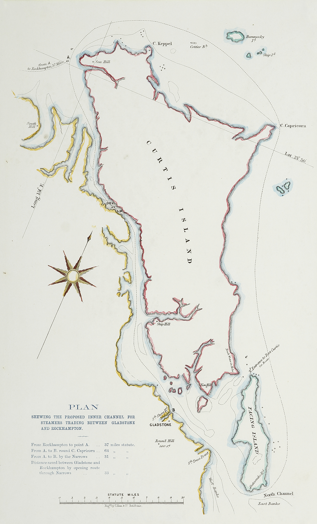 Rare plan of the proposed channel for steamers between Gladstone and Rockhampton by Thomas Ham (1821-1870) printed in 1866.