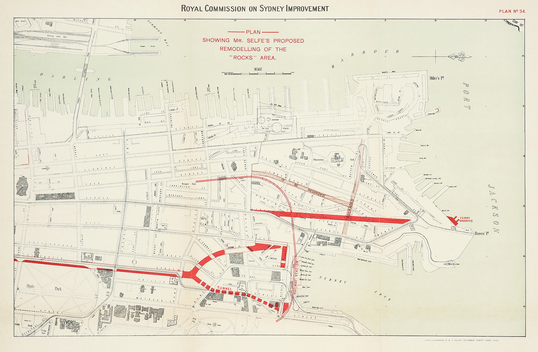 Rare c.19th colour lithograph plan by Norman Selfe (1839-1911) showing his proposed remodelling of the Rocks, made for the Royal Commission on Sydney Improvements.