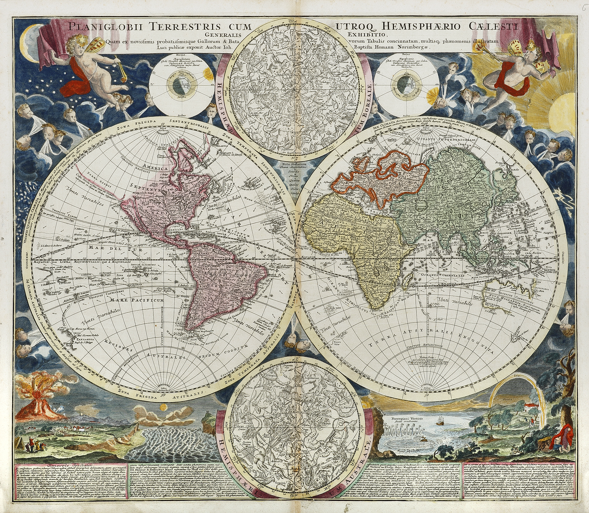 Elaborately decorated with a large title banner held outstretched by two cupids holding torches, the cupid on the right-hand side has the astronomical symbol for Venus situated above his head, while just below his red sash is the symbol for Mercury, the messenger and a god of trade, profit and commerce. Both cupids also have the six pointed star on their foreheads, often used as the symbol for Saturn. There are four smaller spheres surrounding the double hemispheres, two large celestial titled: Hemisphaerium Boreale and Australie, these were derived from Hevelius. No less than twenty five head-winds surround the spheres, while the lower section is richly engraved with natural wonders such as, the eruption of Mount Etna, whirlpools and rainbows, all of which are extensively described in the written text. This is one of the finest double hemisphere maps produced by the Homann’s.