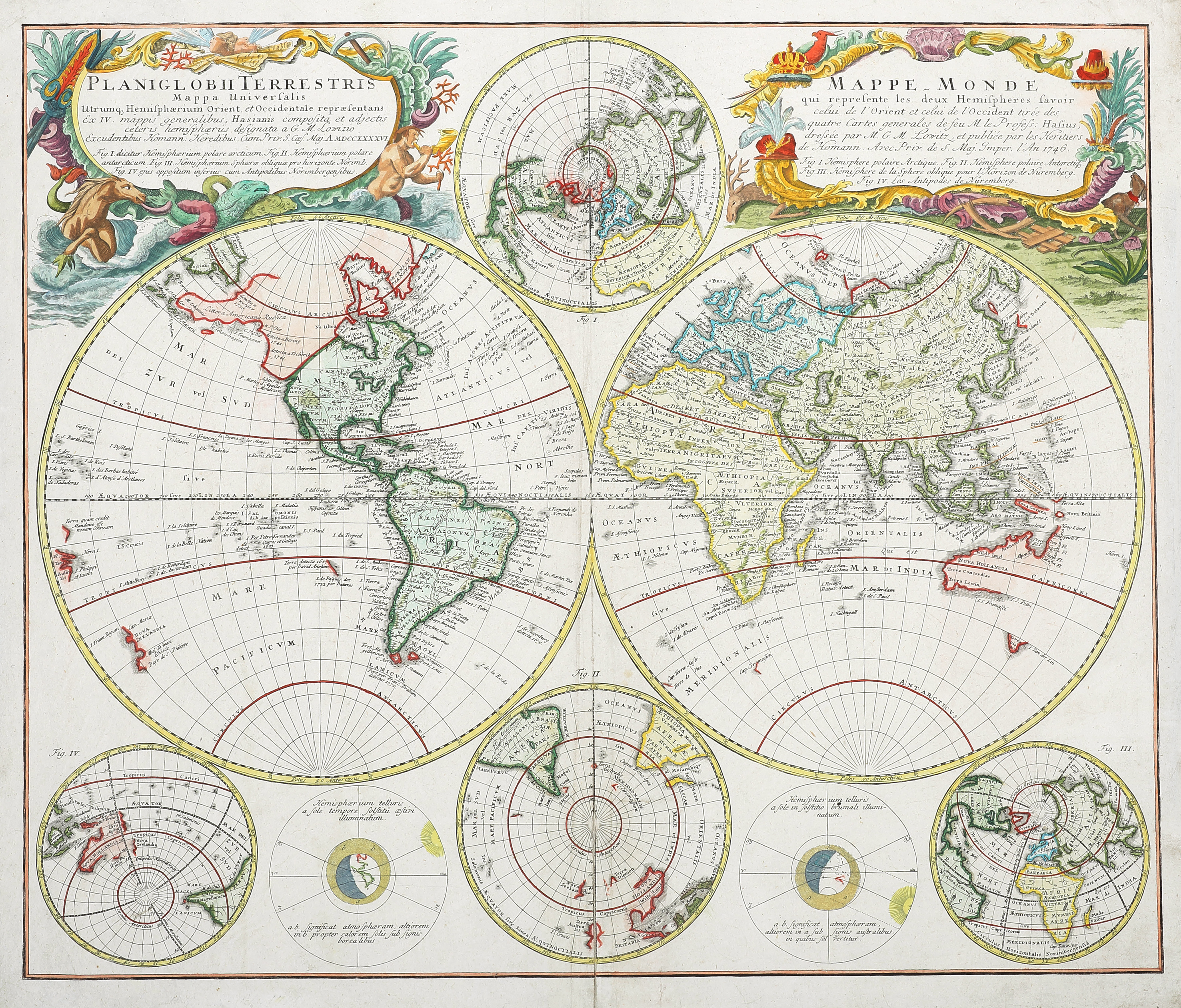 The map is superbly decorated with a pair of elaborate title cartouches at top, one in Latin and the other in French. Between the hemispheres, two circular insets show the world from the North and South Poles and four more circular diagrams feature along the bottom. Two sphere obliques appear in the corners, one showing the world centred on Nuremberg where Homann died in 1724 and the other showing its antipode. The two smaller circles are solar diagrams. The Latin title cartouche in the top left corner is decorated with the figure of Triton, son ofPoseidon and Amphitrite, the god and goddess of the sea. He is shown blowing on his conch shell which he used to calm and raise the ocean waves and to his left is his sea horse. The right title cartouche is a festoon, decorated with animals, a parrot and crowns. T