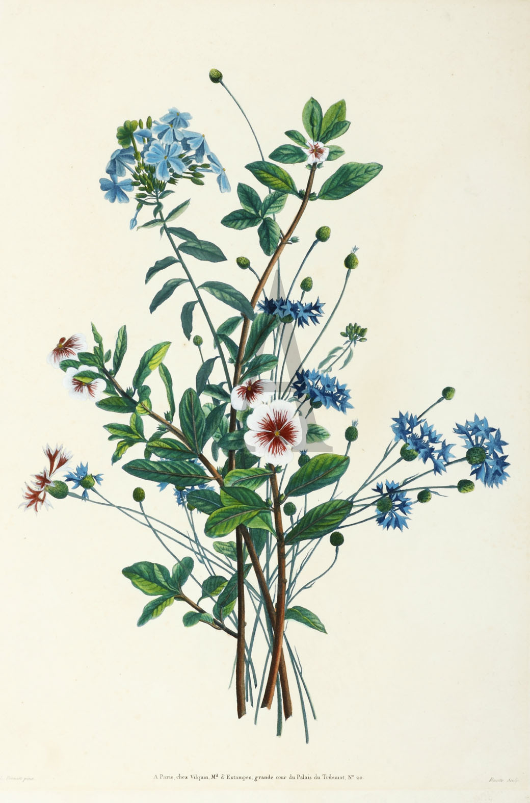 Stipple engraving with hand-finished coloring from Jean Louis Prevost’s work Collection des Fleurs et des Fruits, published in Paris by Vilquin in 1805. References: Sitwell p.127,
