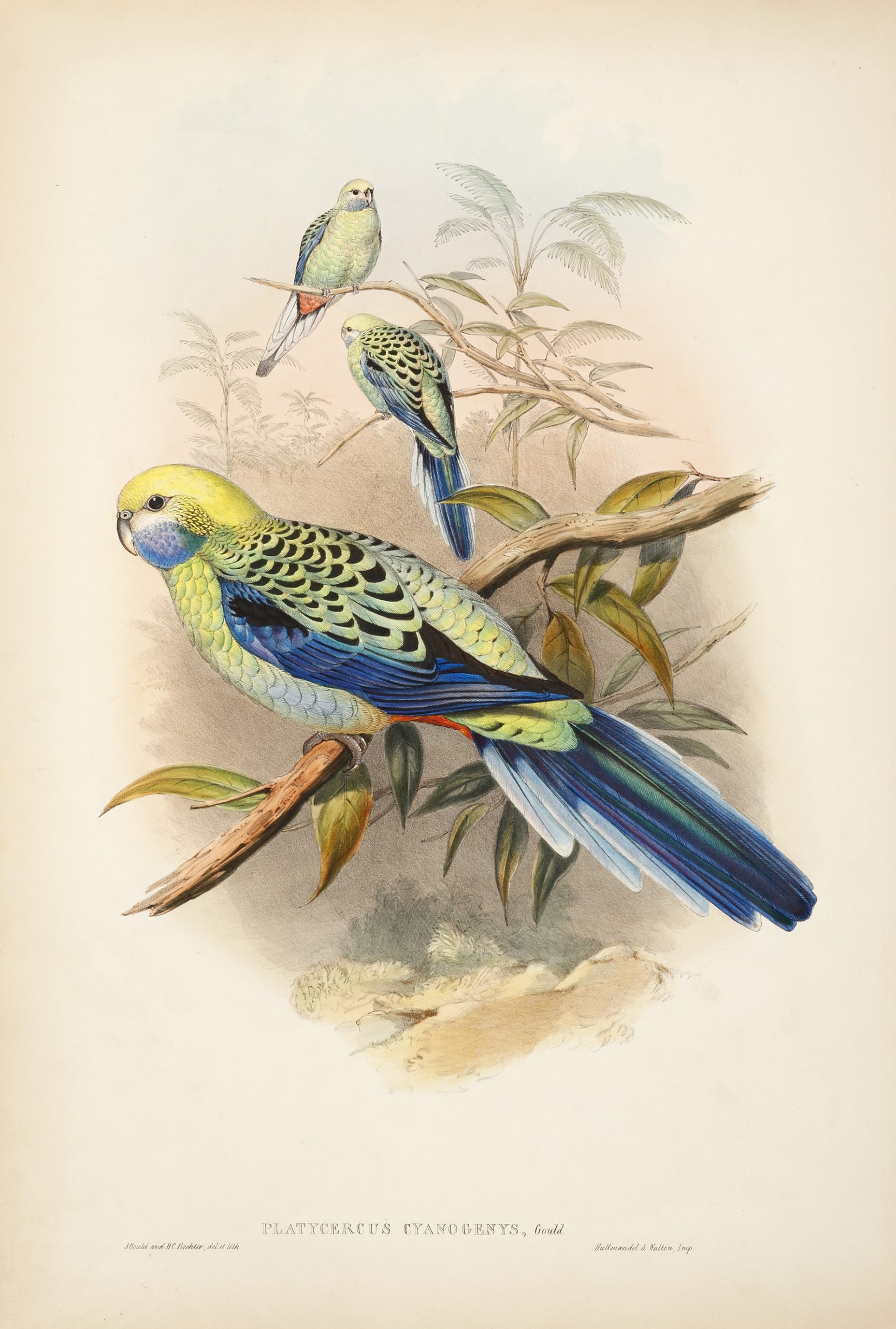 Rare lithograph of the best and largest colonial image of the Blue-cheeked Rosella by John Gould from his epic series, The Birds of Australia, by Richard and John E. Taylor, London.
