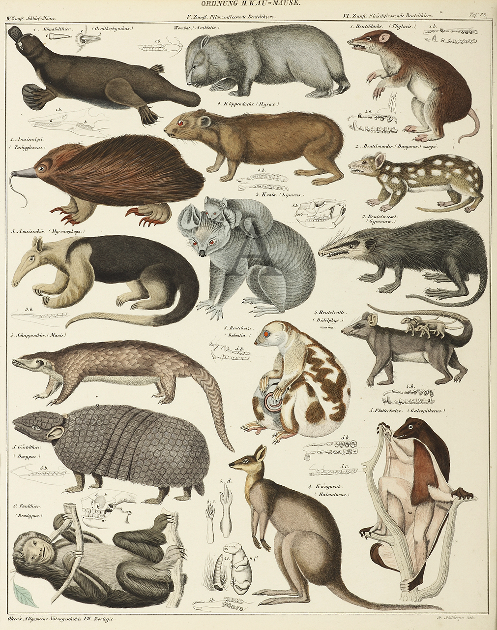 An interesting and scarce print, the images variously issued by various artists but here depicted all on one sheet. With superb original hand colouring. From Oken’s Allgemeine Naturgeschicht with engravings by Johann Conrad Susemihl.