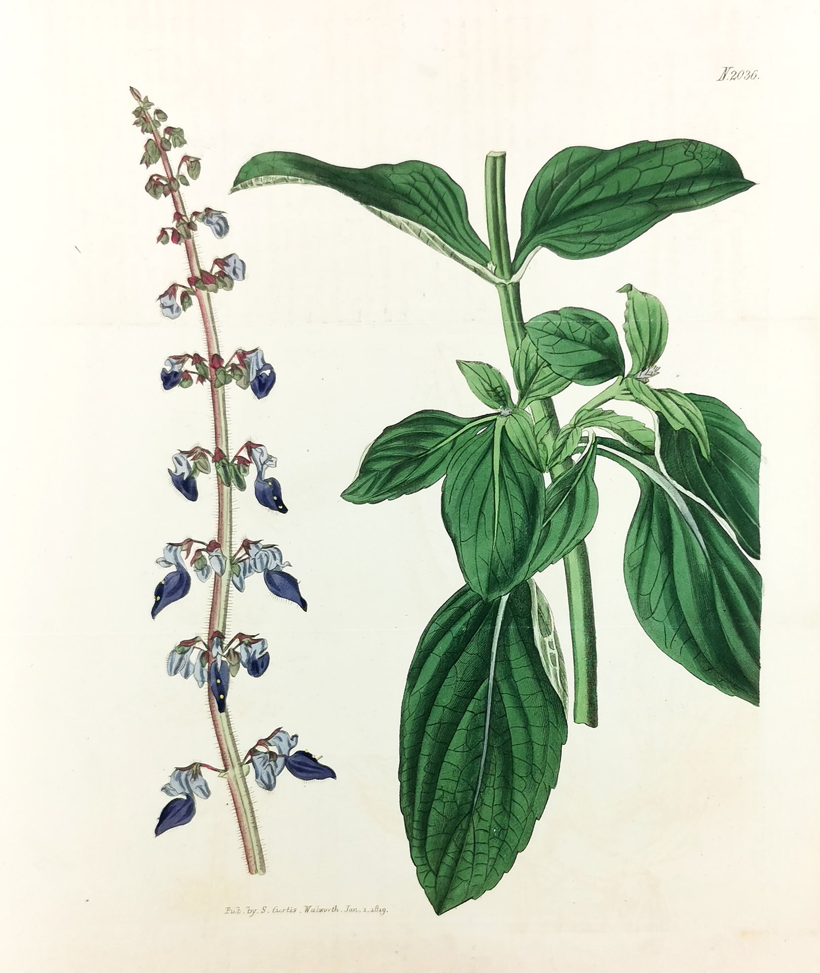 Fine original hand coloured botanical illustration of the Coleus barbatus, a tropical perennial plant related to the typical coleus species. From Curtis’s Botanical Magazine: or, Flower-Garden Displayed.