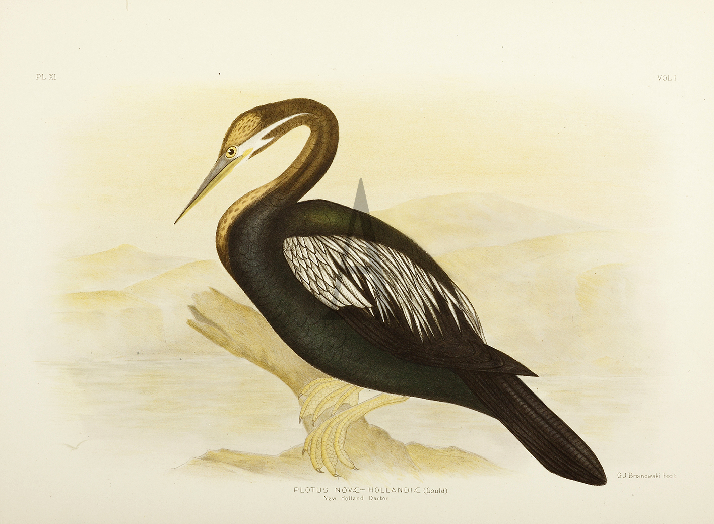 Lithograph of the Australasian darter or Australian darter /Anhinga novaehollandiae, from Broinowski’s, Birds of Australia.