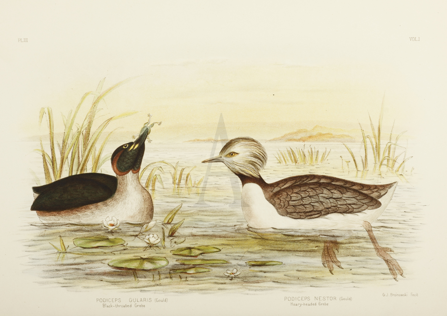 Podiceps Gularis. Black-throated Grebe. Podiceps Nestor. Hoary-headed Grebe. - Antique Print from 1889
