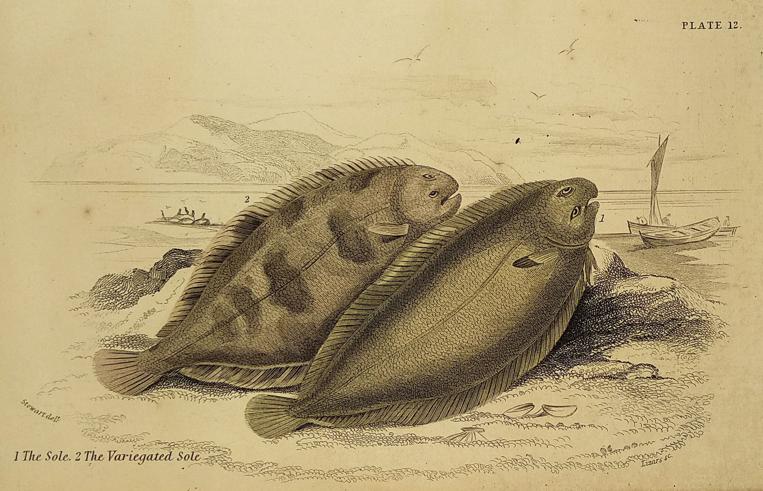 1. The Sole. 2. The Variegated Sole. - Antique Print from 1843