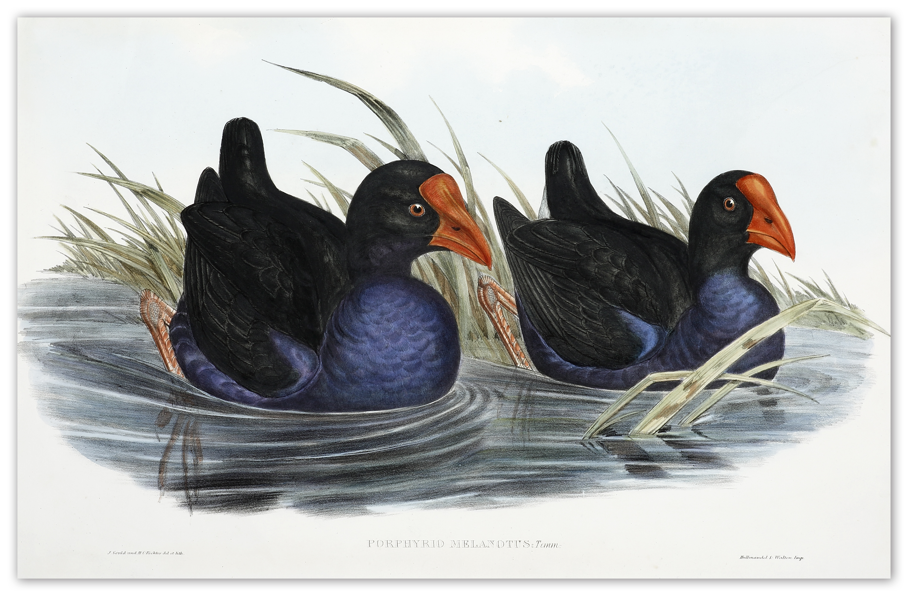 Rare lithograph of the best and largest colonial image of the Pukeko or Australian swamphen by John Gould from his epic series, The Birds of Australia and Adjacent Islands, published for the author, printed by Richard and John E. Taylor, London.