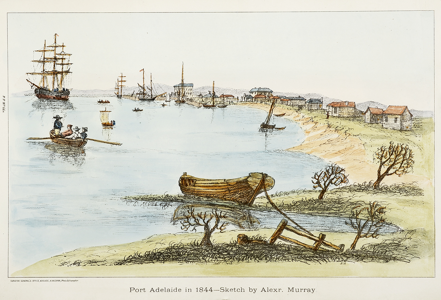 Early view of Port Adelaide as it was in 1844 and known at the time as ‘Port Misery’. Probably based on Samuel Thomas Gill’s watercolour of the same date.