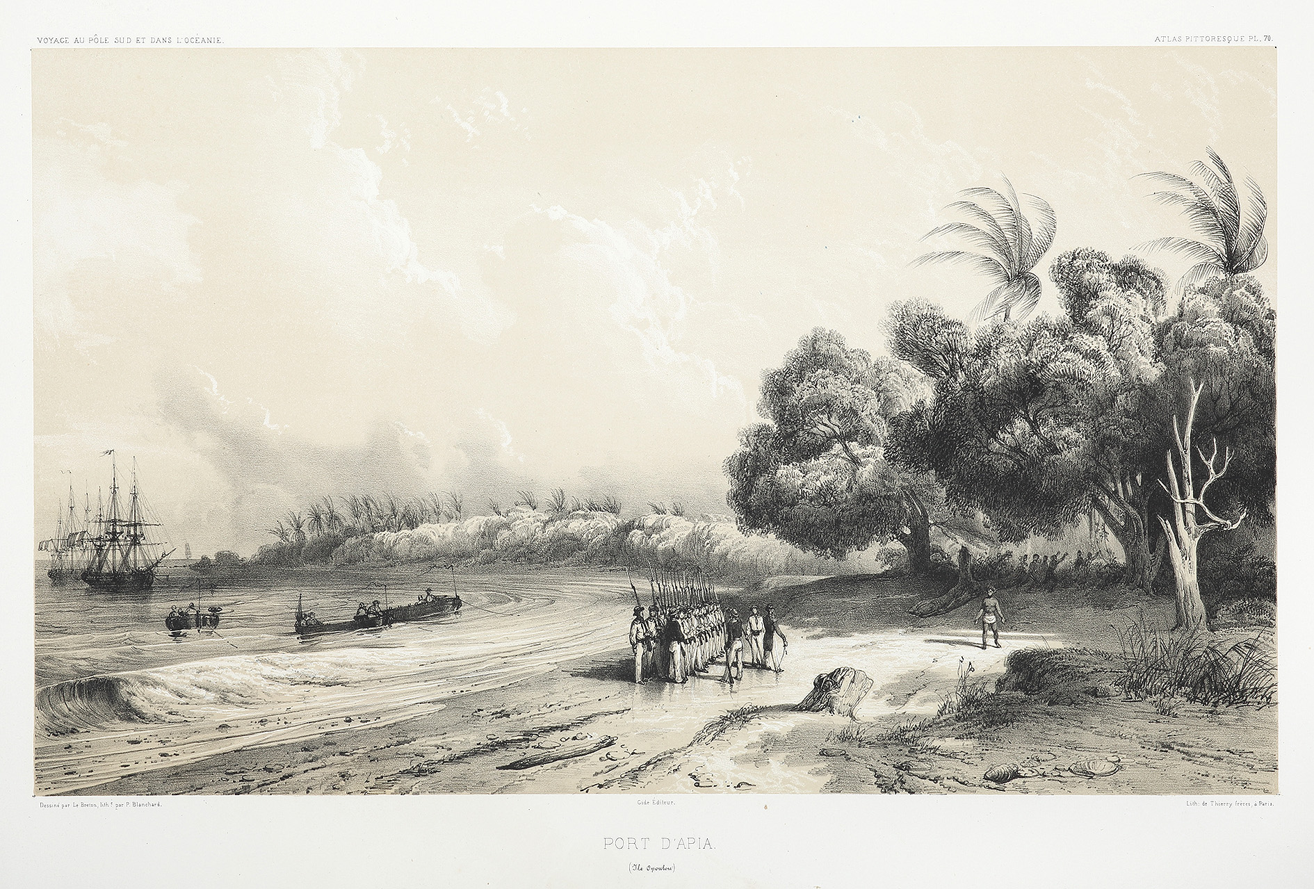 Superb c.19th lithograph of Dumount D’Urville and the armed crew of the l’Astrolabe et la Zélée on the beach of present day, Apia Harbour, on Upolu Island, Samoa by Louis le Breton (1818-1866).