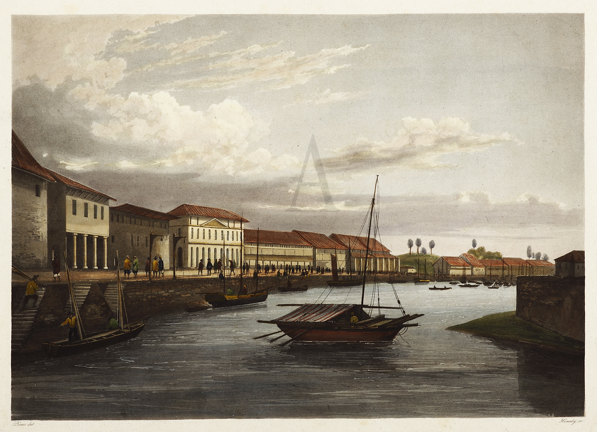 A view of the mouth of the Singapore River looking upstream, on the left is South Boat Quay. European merchants displaced from the north bank used warehouses on the originally marshy south bank after it was reclaimed in 1822. The quay was faced with masonry and provided with a double row of steps for access at high and low tide. From the voyage account of Captain Cyrille Laplace in La Favorite to the Indes entitled Voyage Autour du Monde. Laplace was instructed to thoroughly explore the Indian Ocean and the route to the Indies via the Strait of Malacca, which runs between Sumatra and Malaysia, into the China Sea.
