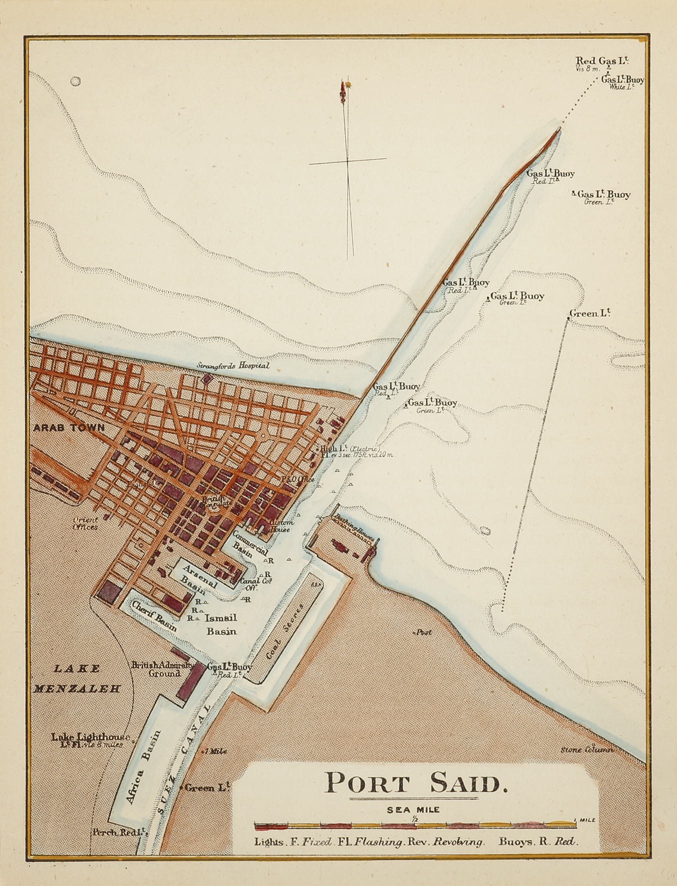 Scarce map of Port Said, Egypt. Below the title panel are descriptions of the navigational lights.