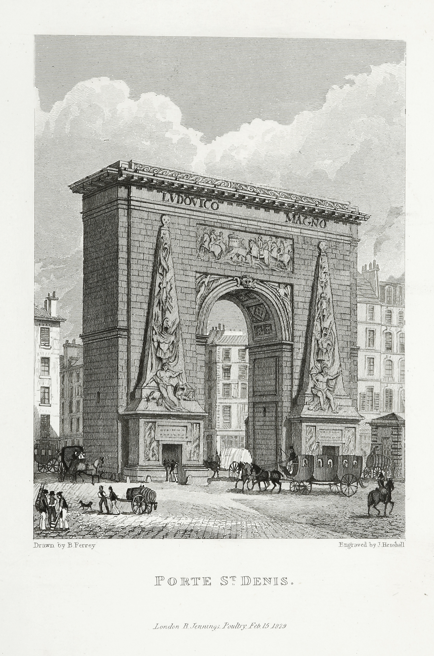 Nineteenth century engraving of the The Porte Saint-Denis, a Parisian monument.