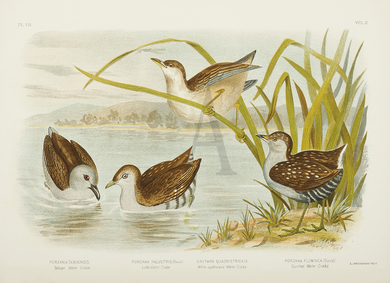 Porzana Tabuensis. Tabuan Water Crake. Porzana Palustris. Little Water Crake. Erythra Quadristricata. White-eyebrowed Water Crake. Porzana Fluminca. Spotted Water Crake