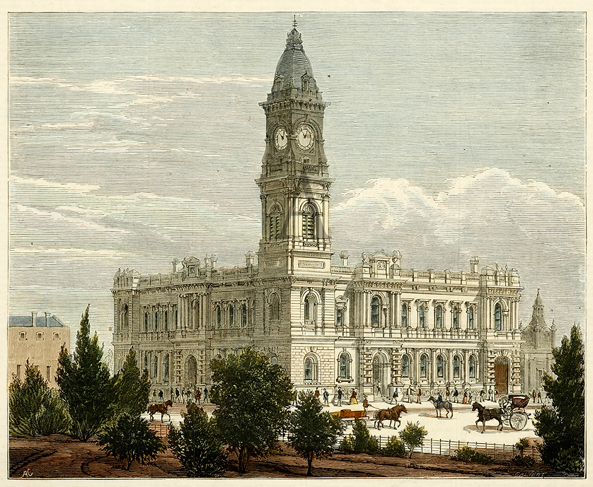 Scarce engraving of the newly erected GPO in King William Street, Adelaide.