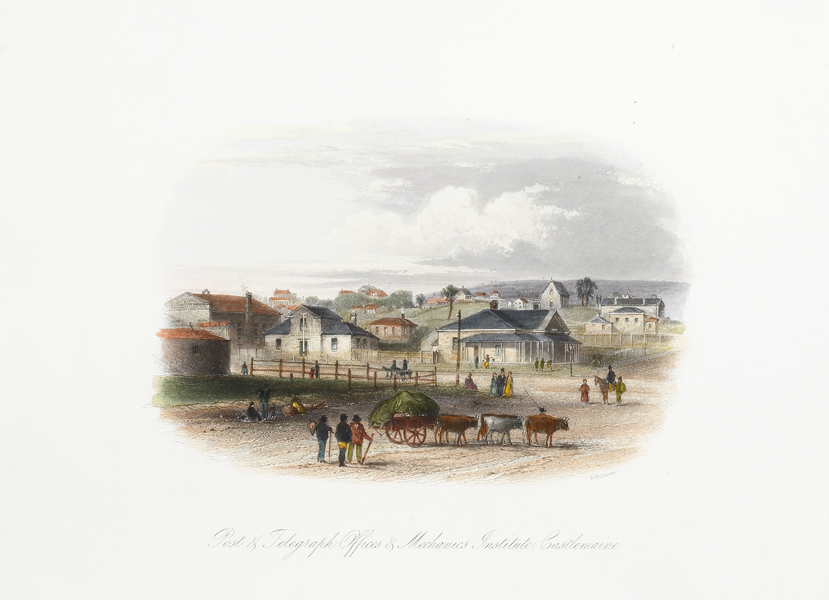 Colonial engraving of the Mechanics Institute situated at 216 Barker St, Castlemaine Victoria.