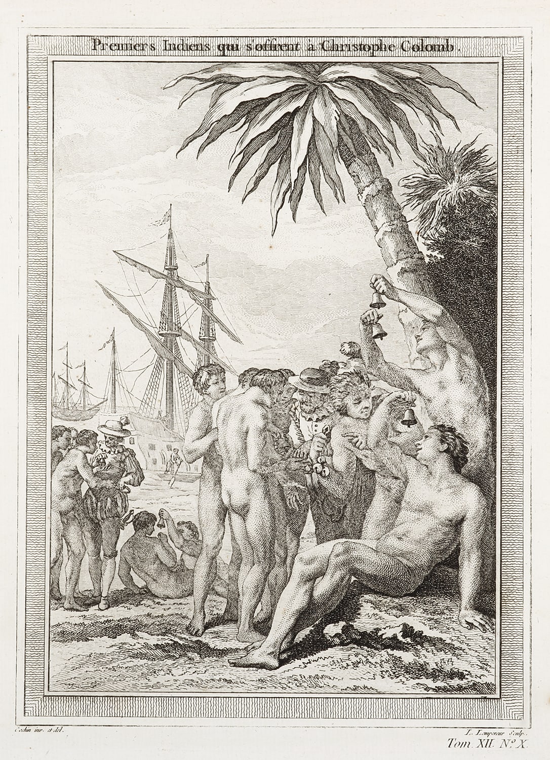 C.18th engraving of Christopher Columbus giving gifts to the natives. From Prevost, Abbe. Histoire générale des voyages : ou, Nouvelle collection de toutes les relations de voyages par mer et par terre qui ont été publiées jusqu’à présent dans les différentes … Read Full Description