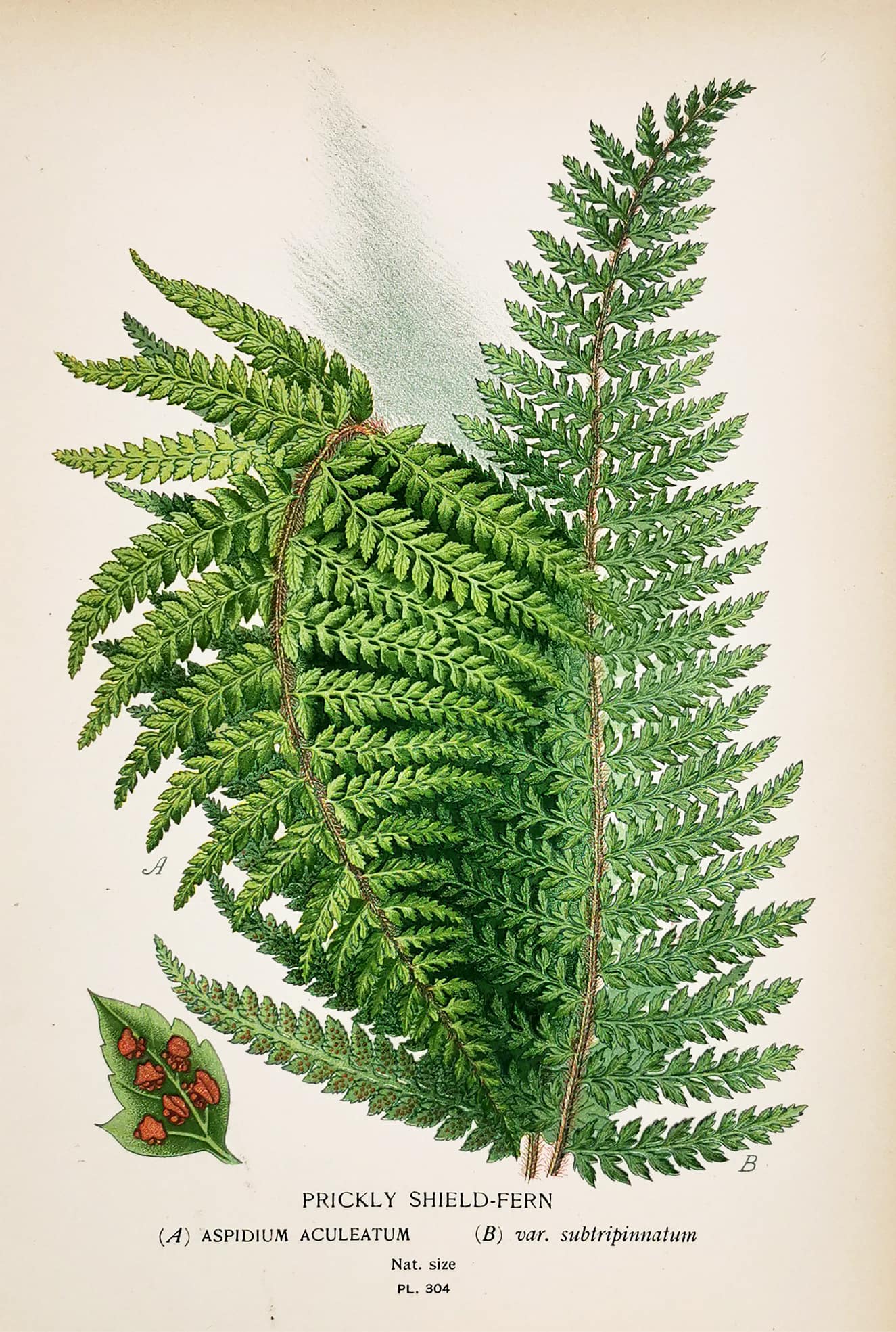 Engraving of the Prickly Shield-Fern. Fine botanical lithograph from Edward Step’s, Favourite Flowers of the Garden and Greenhouse.