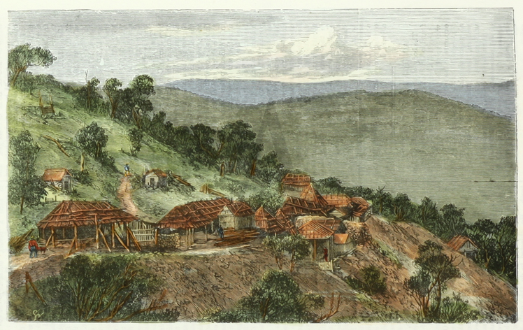 Scarce colonial engraving of Hawkins mine, Hill End. Surface gold was won from Hawkins Hill in 1855 and reef claims were worked along the right bank of Golden Gully from 1859.